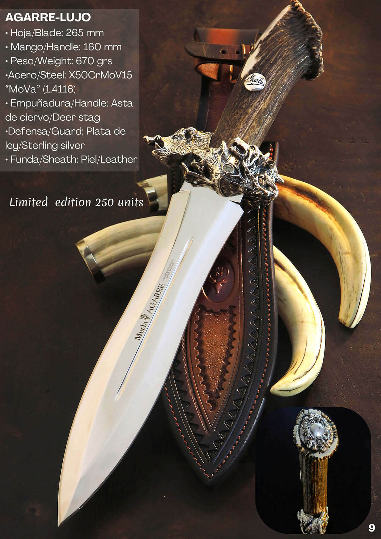 Un cuchillo de colección con hoja de acero inoxidable X50CrMoV15 de 26.5 cm de longitud con doble filo. Su empuñadura es de asta de ciervo con defensa de plata de ley con tallado de jabalí y perros de caza.