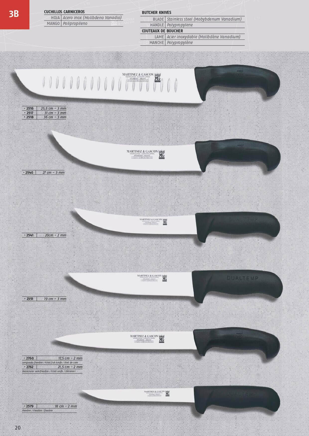 Cuchillos carnicero con hoja de acero inoxidable y mango de Polipropileno. Cuchillo alveolado. Cuchillo despellejar. Cuchillo filetero. Cuchillo lenguado. Cuchillo filetero extra flexible.