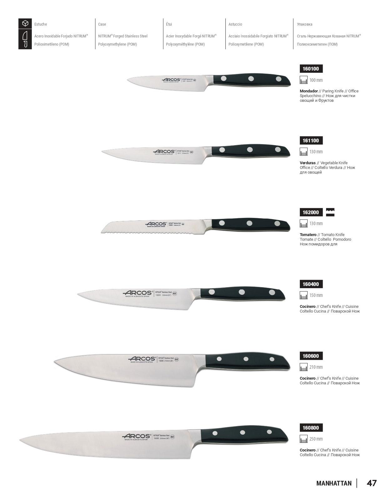 Cuchillos de cocina de la serie Manhattan de la marca Arcos con estuche, hoja de acero inoxidable forjado NITRUM y mango de Polioximetileno (POM)