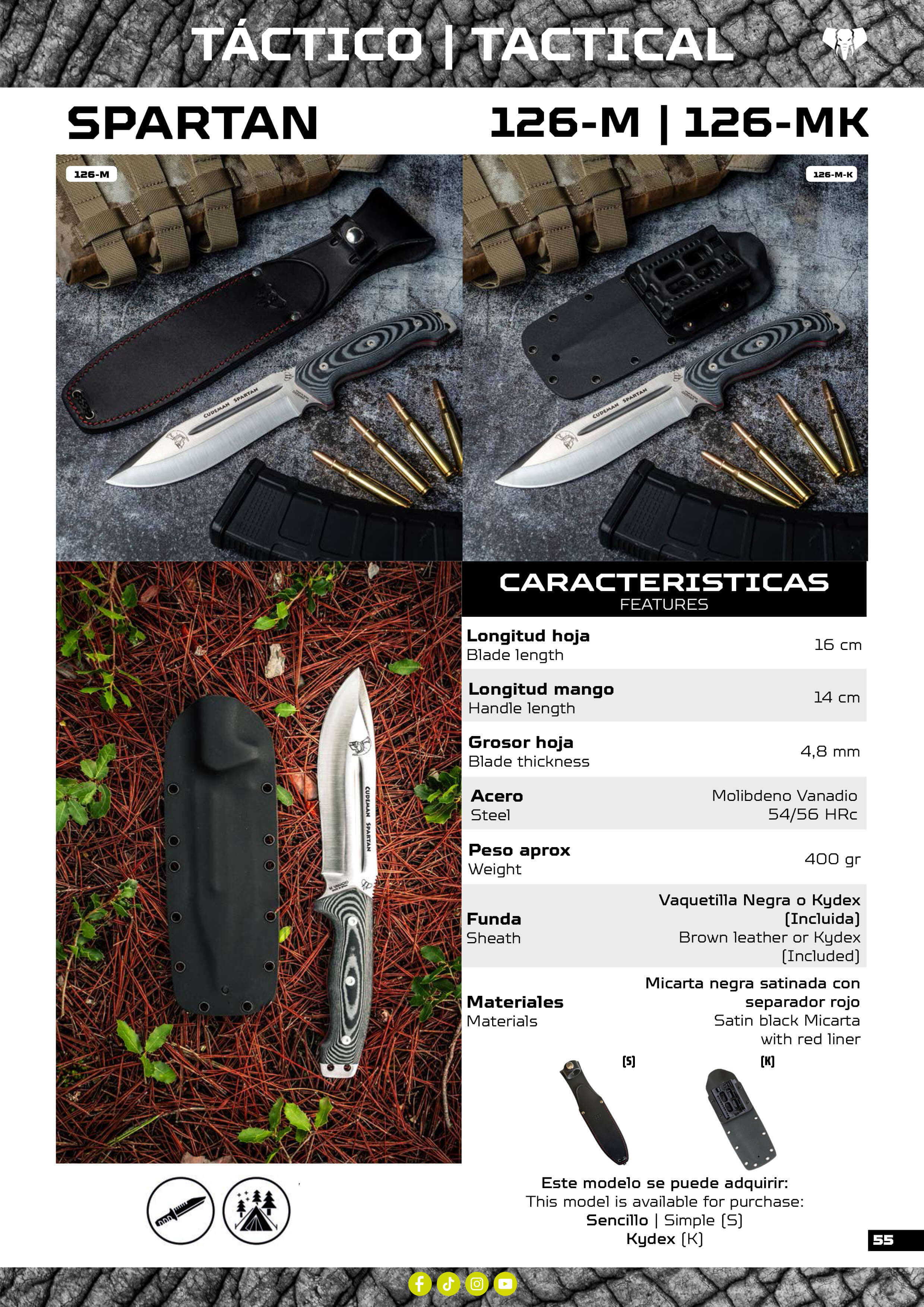 Cuchillo de supervivencia Spartan fabricado con acero MOVA de dureza 54-56. Mango en micarta con separadores.