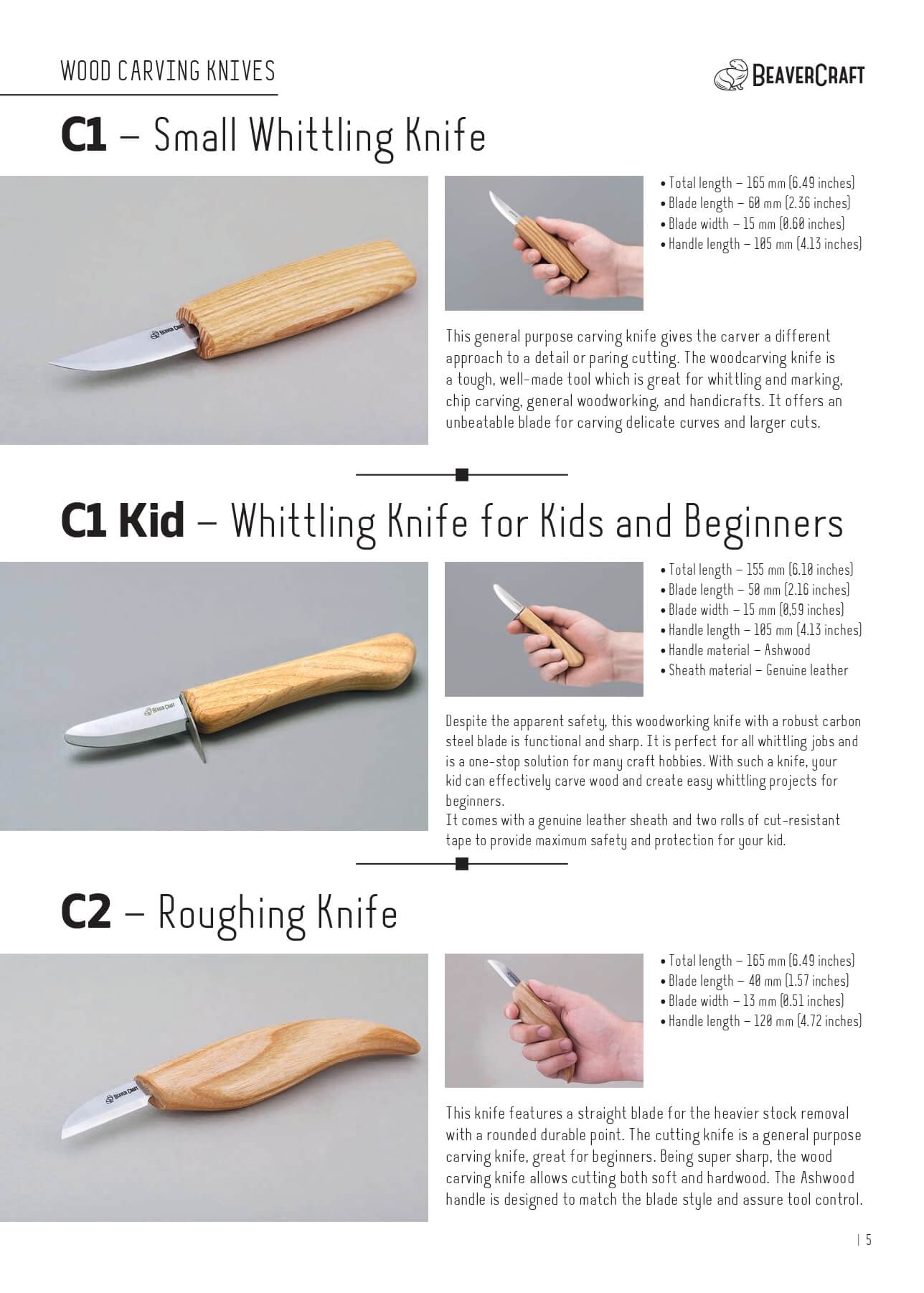 Cuchillos para tallar con hojas de acero al carbono y mangos de madera de fresno. Estos cuchillos están diseñados para que puedas tallar de diferentes maneras, con ellos podrás tallar tanto trozos grandes para quitar partes sobrantes de madera, también para pequeños detalles o para tallado general, como curvas o formas. Estos cuchillos son seguros y protegen al usuario de cualquier corte, especialmente el diseñado para niños.