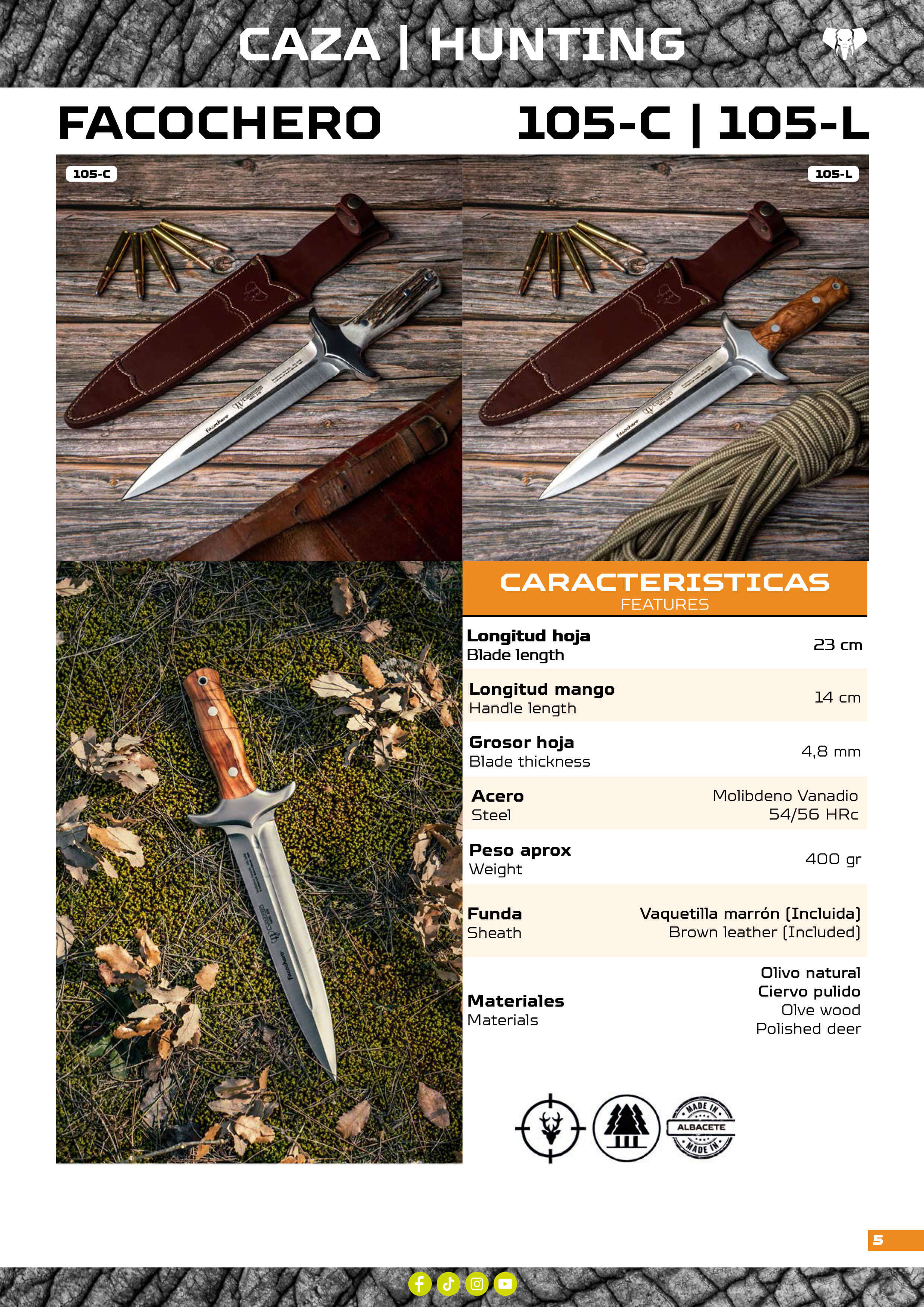 Hoja de acero Molibdeno Vanadio (dureza 54/56 HRc) de 22,5 cm de largo con vaciado cóncavo y acabado satinado. Grosor de la hoja: 5 mm, ancho de pala: 4.2 cm.
