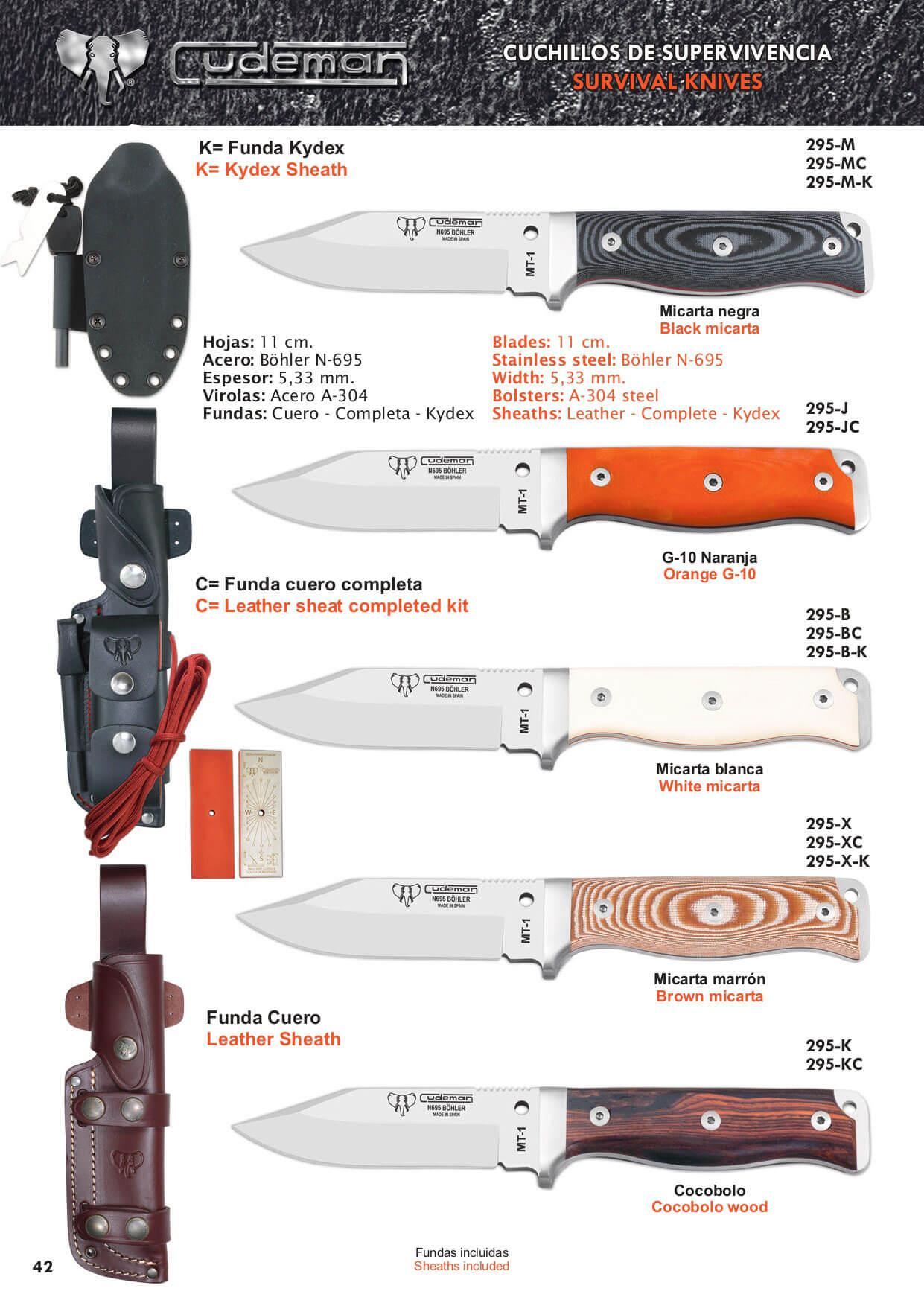 Cuchillos enterizos con cachas de mikarta de distintos colores, G10 naranja o madera de cocobolo. Longitud de hoja: 11 cm. Longitud total: 22.5 cm. Espesor de hoja: 5,33 mm. Hojas en acero Böhler N695 /MOVA. Virolas de acero A-304.