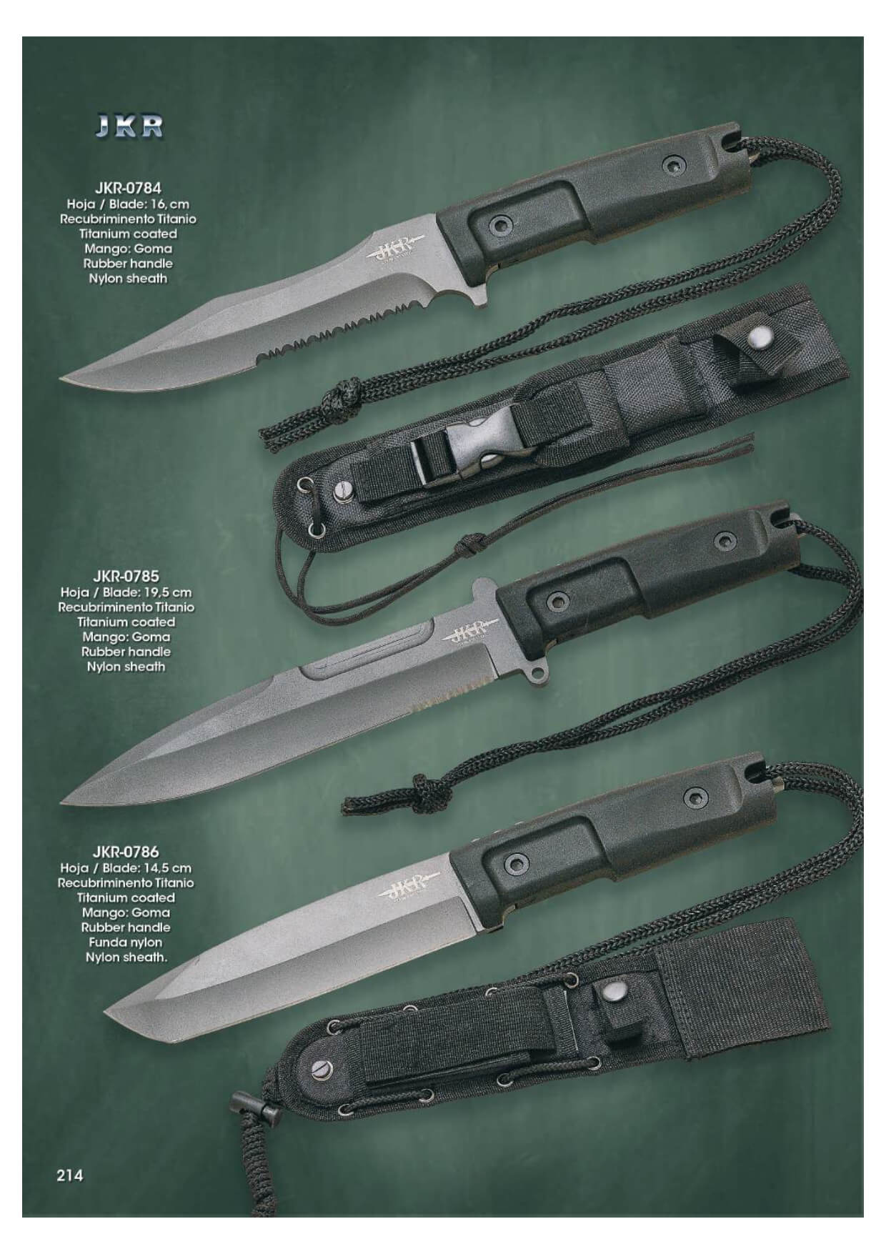 Cuchillo militares JKR con hoja clip point de acero inoxidable con acabado pavonado negro y mango de goma. Funda de nylon y kydex.