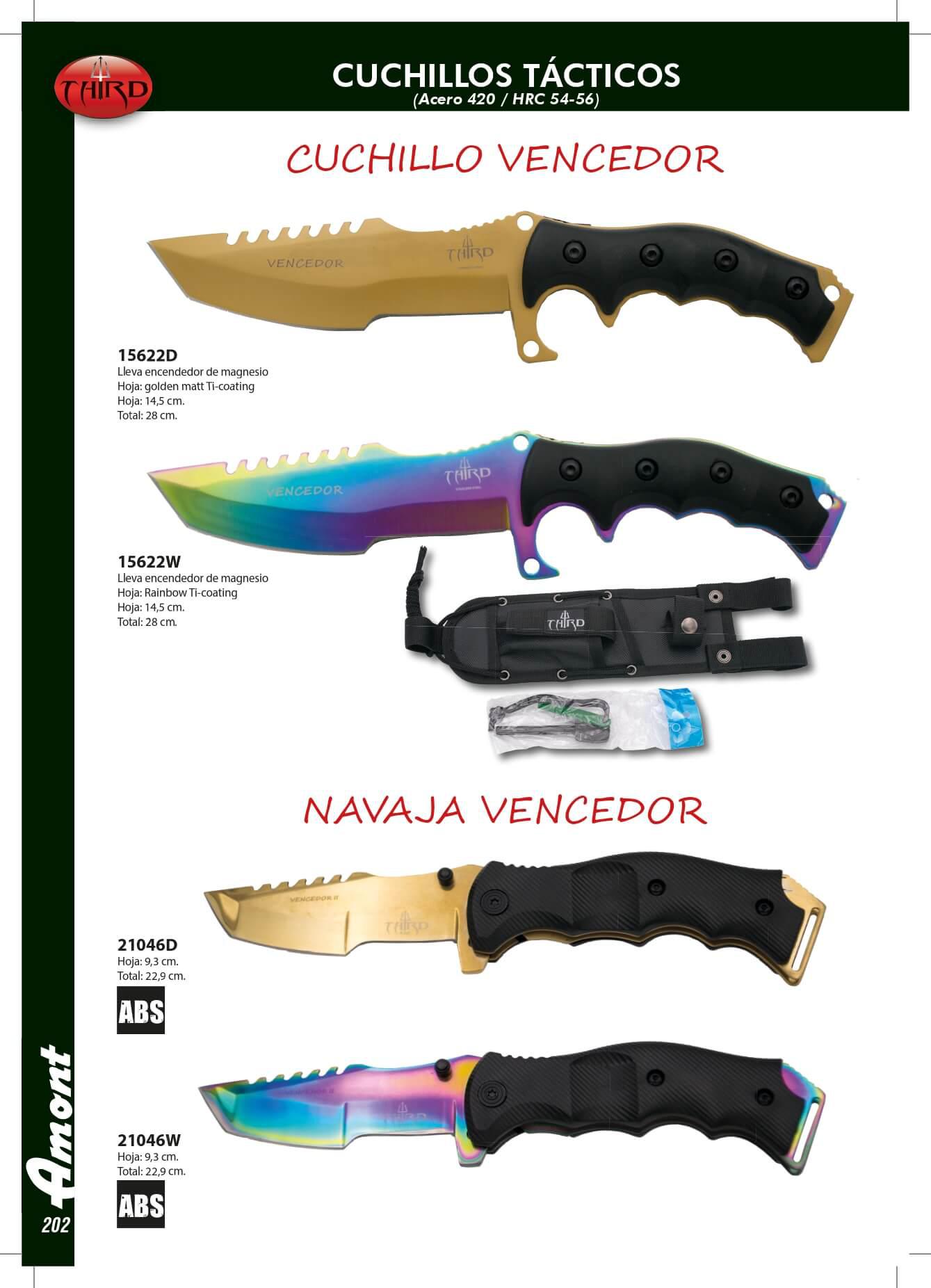 Longitud de hoja: 14.5 cm. Longitud total: 28 cm. con pedernal. Hoja: rainbow Ti-coating.