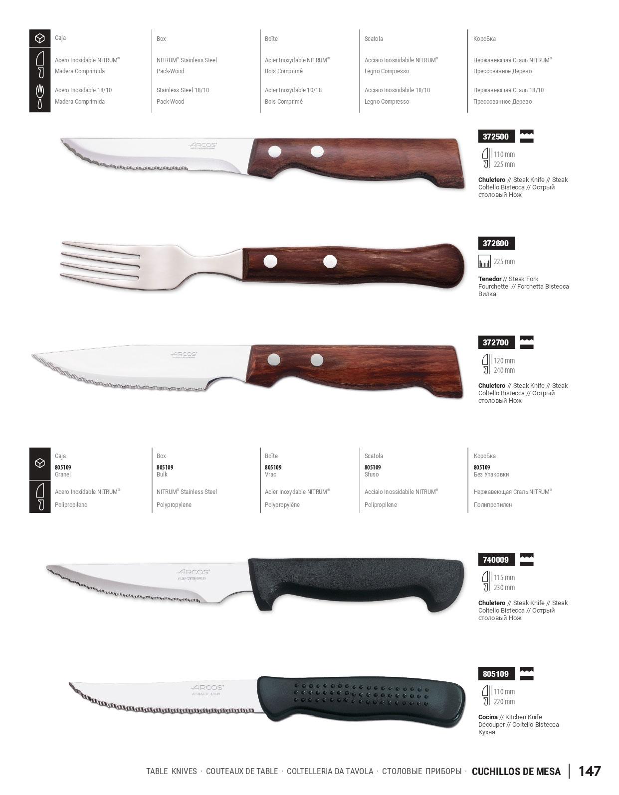 Cuchillos y tenedores para carne con mango de madera comprimida o polipropileno. Hoja de acero inoxidable NITRUM.