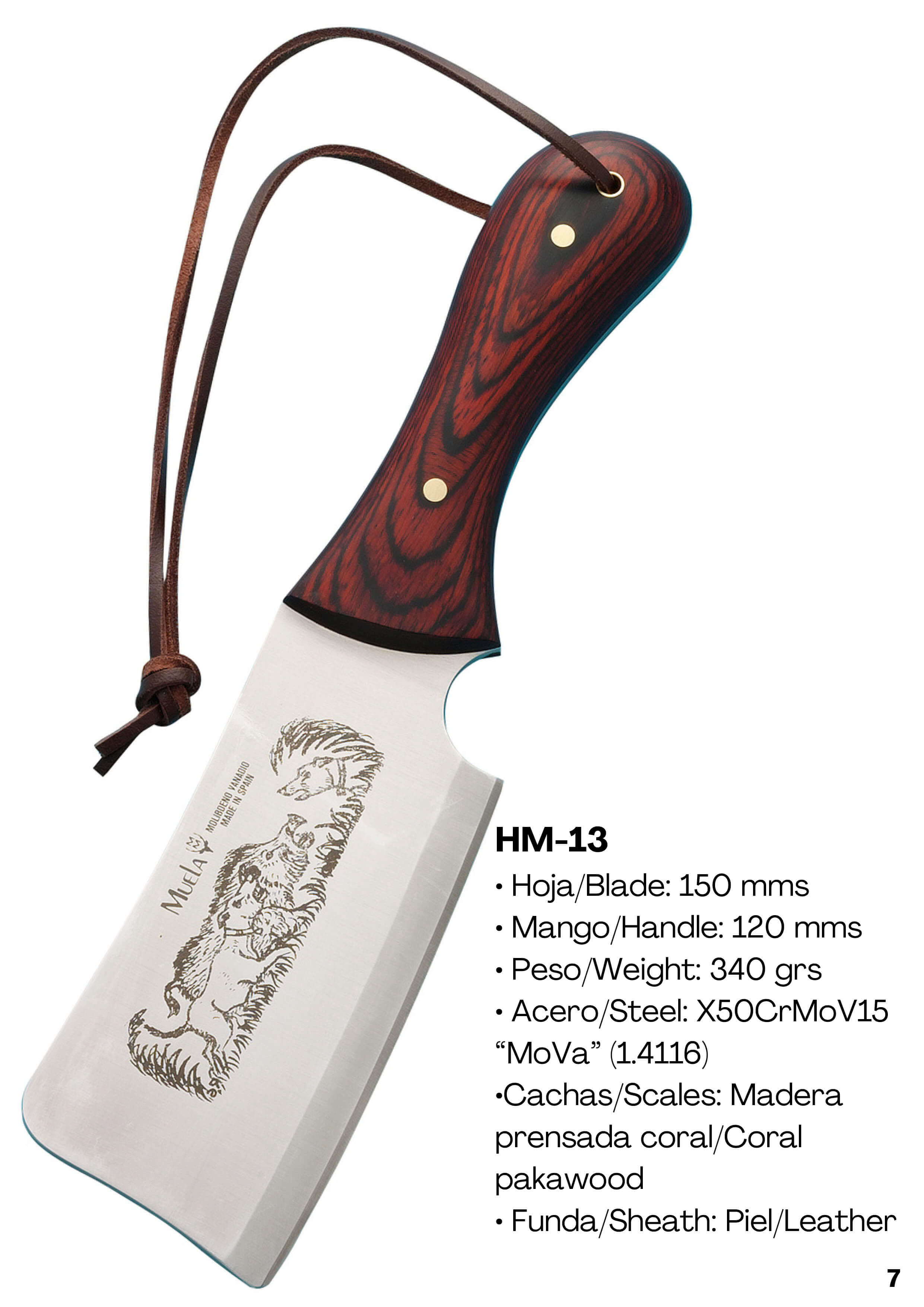 Hacha de caza Muela HM-13 con puño de madera roja y hoja enteriza de acero Molibdeno Vanadio decorada con escena de caza.