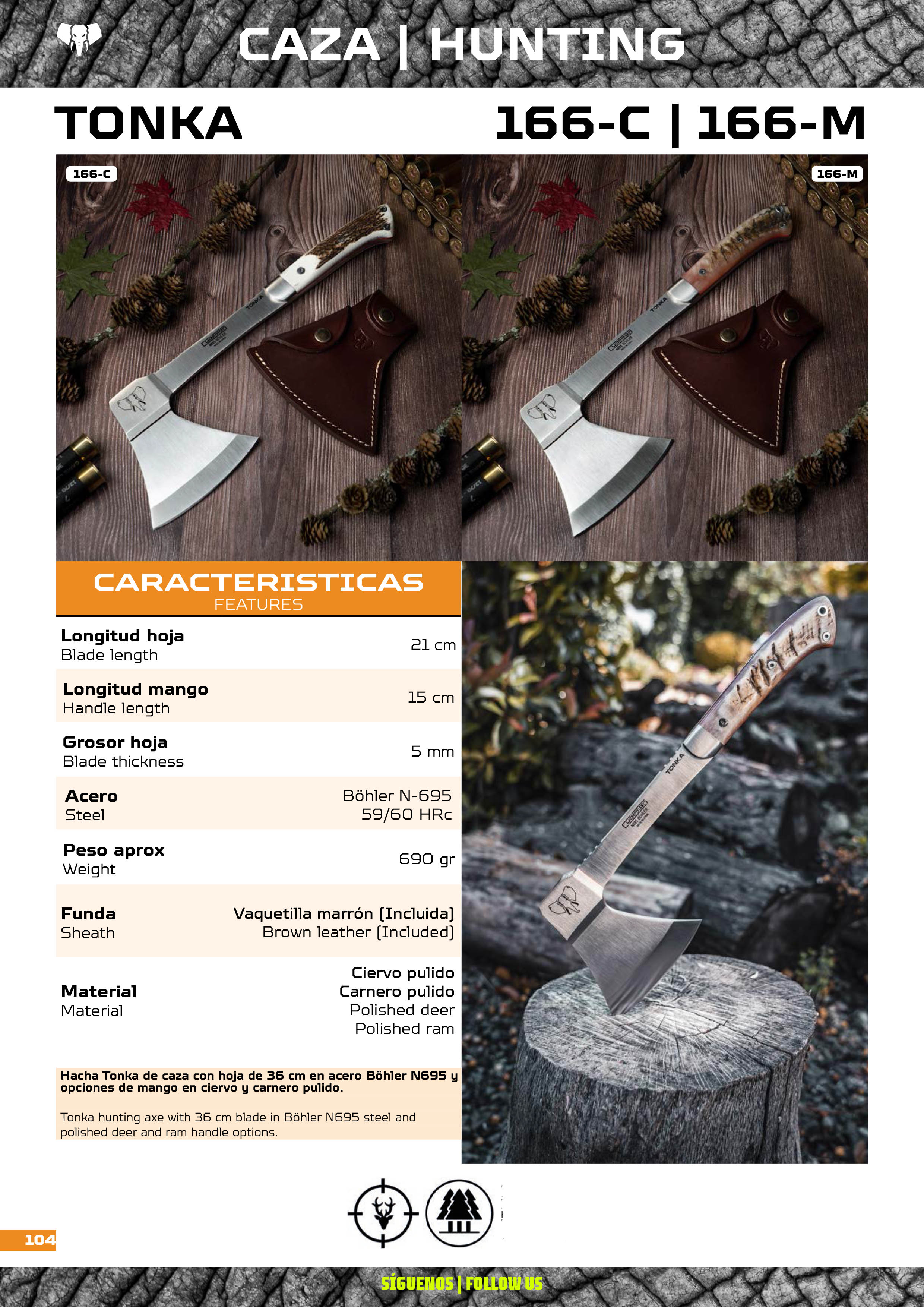 Hachas de caza y supervivencia Tonka con acero Böhler N695 y mango de ciervo, asta rústica, micarta negra, madera de nogal o G-10 naranja. Funda de cuero incluida.