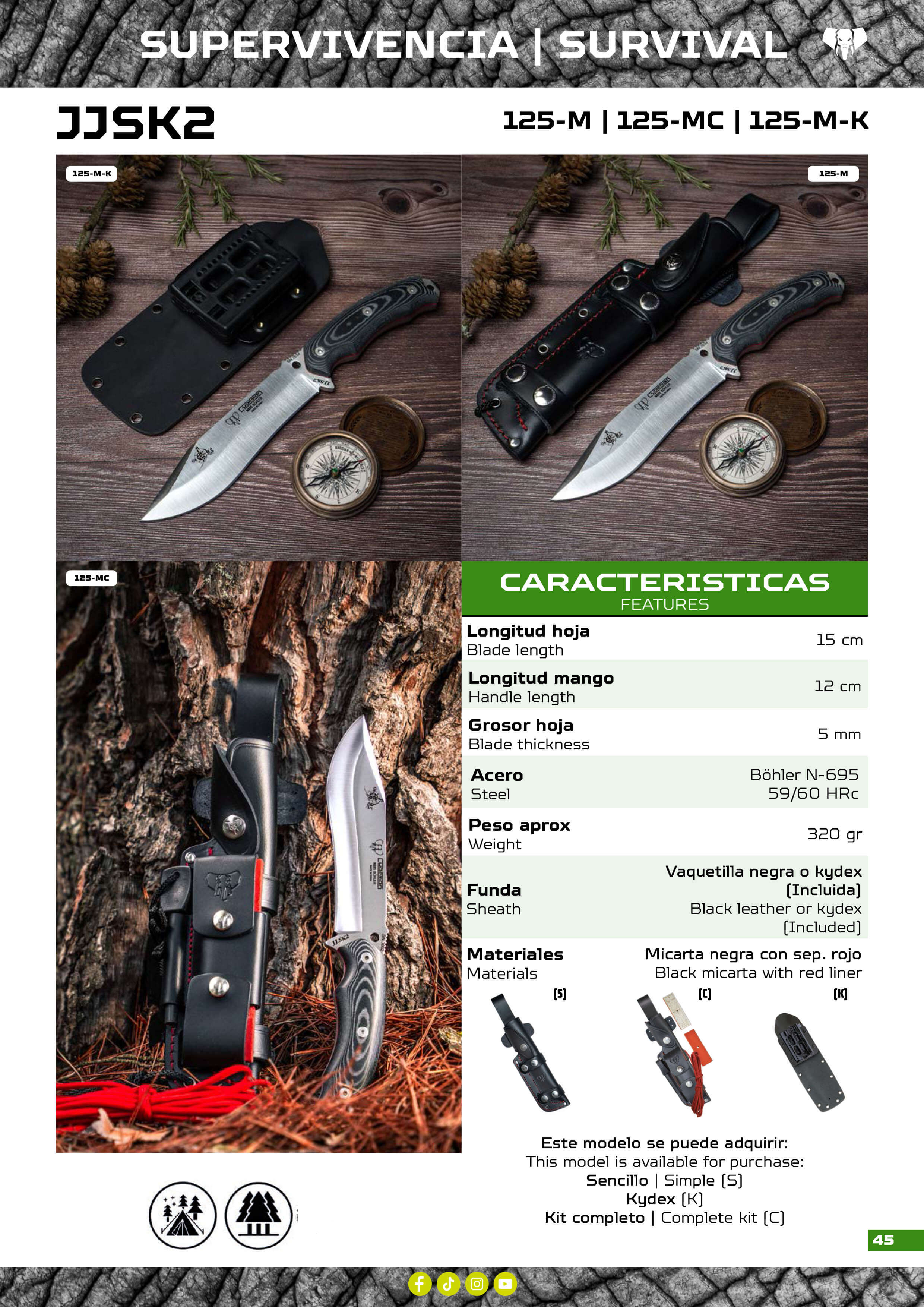 Cuchillos de supervivencia Cudeman JJSK2, con acero MOVA o Böhler N-695, mango de micarta y distintos accesorios para la supervivencia. Los modelos cuya referencia es acabada en C disponen de un kit de supervivencia más completo que las demás referencias.