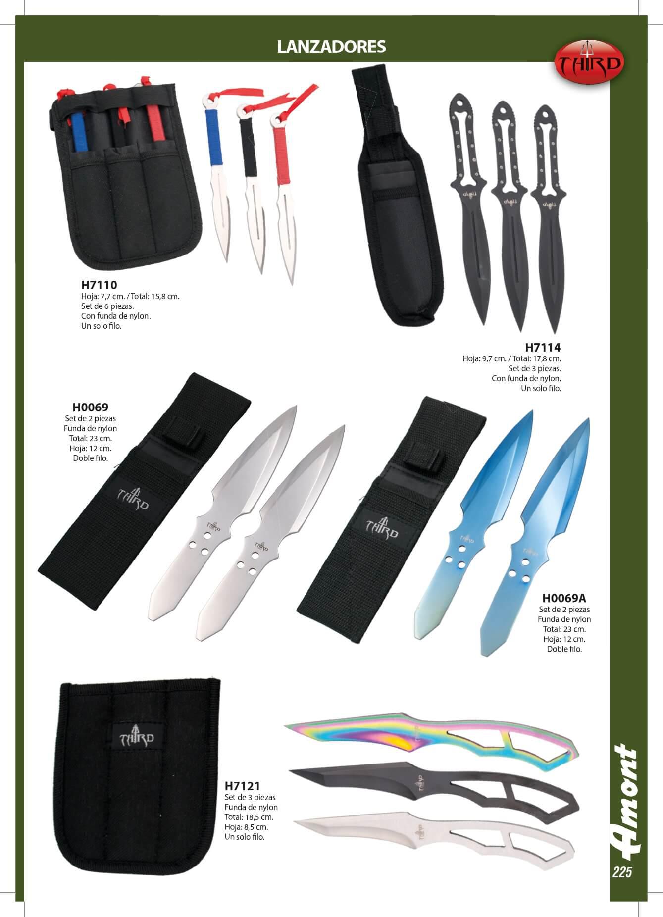 Lanzadores. H7110 Longitud de hoja: 7.7 cm. Longitud total: 15.8 cm. Set 6 piezas. Con funda de nylon. Un sólo filo. H7114 Longitud de hoja: 9.7 cm. Longitud total: 17.8 cm. Set 3 piezas. Con funda de nylon. Un sólo filo.