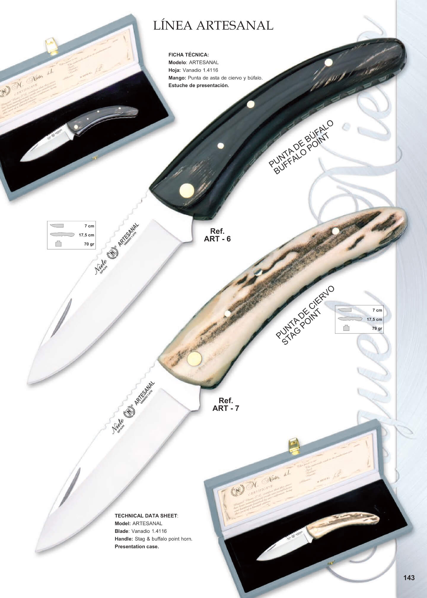 ART-6 Empùñadura de asta de bufalo. Longitud hoja 7 cm. Total 17,5 cm. Peso 70 gr. ART-7 Empùñadura de asta de ciervo. Longitud hoja 7 cm. Total 17,5 cm. Peso 79 gr.
