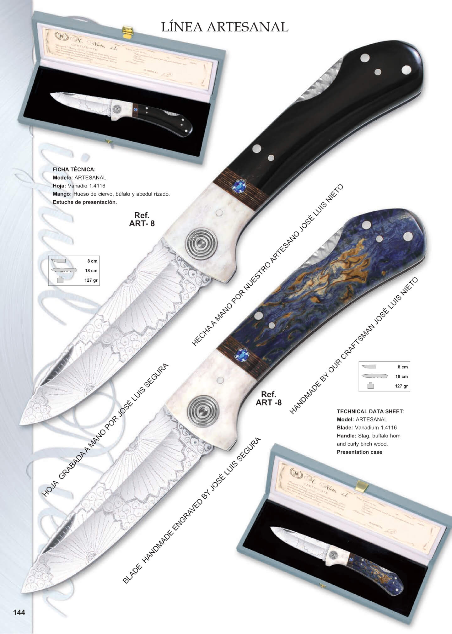 Linea Artesanal 8Hecha a mano por el artesano Jose Luis Nieto.Hoja acero Vanadio 1.4116Mango: Hueso de ciervo, búfalo y abedul rizado.Longitud hoja 8 cm. Total 19 cm. Peso 127 gr.Presentación en estuche.