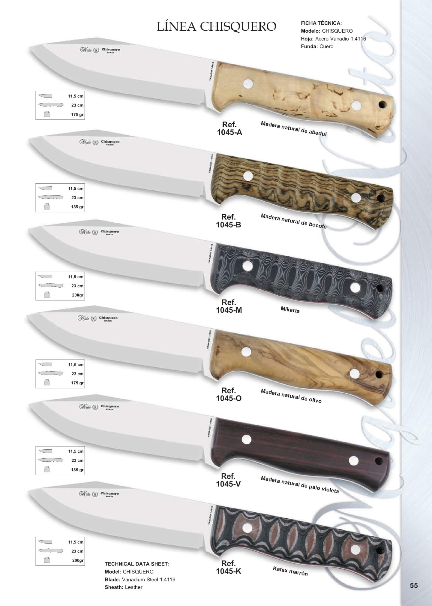 Cuchillos enterizos Nieto Chisquero con hoja de 11.5 cm de acero Vanadio 1.4116 y funda de cuero.