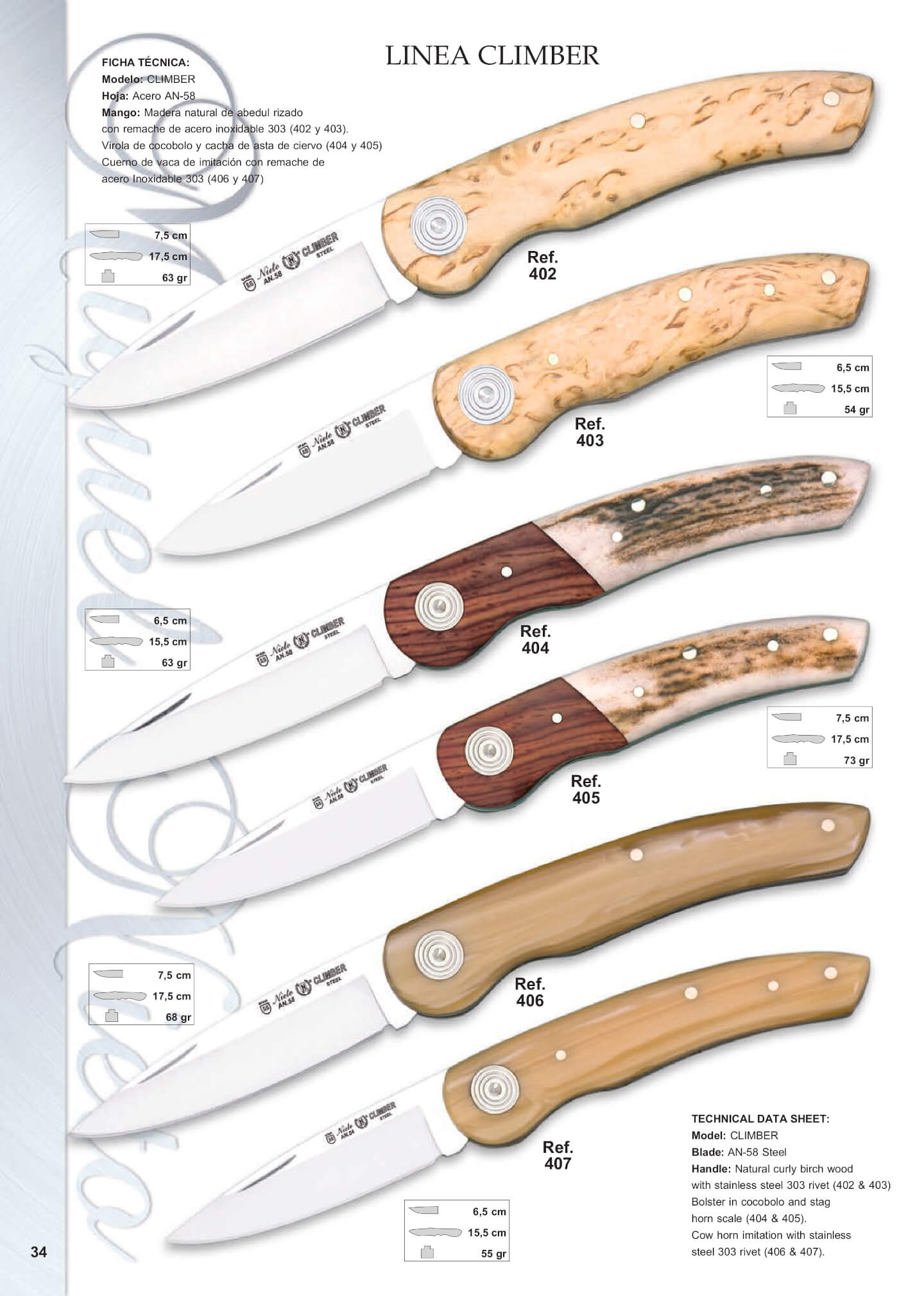 Mango: madera natural de abedul rizado con remache de acero inoxidable 303. Hoja: 7.5 cm. Longitud total: 17.5 cm. Peso 63 gr.