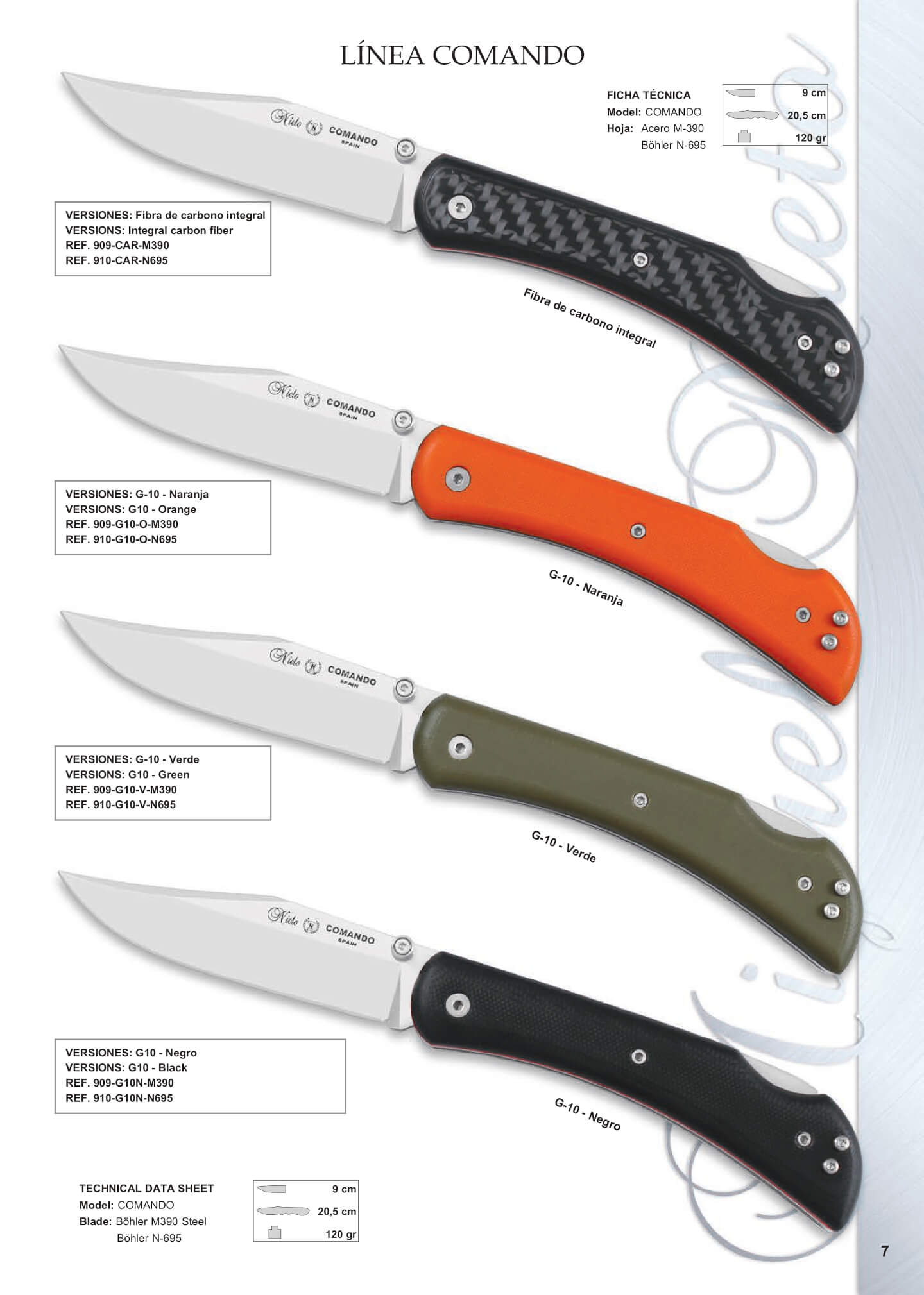 Navaja de supervivencia línea Comando. Hoja de 9 cm, longitud total: 20.3 cm. Peso: 120 gr.Bloqueo trasero. Cachas de G10 o fibra de carbono. Disponible en dos tipos de acero: * 910: acero Böhler N695. * 909: acero Böhler M390