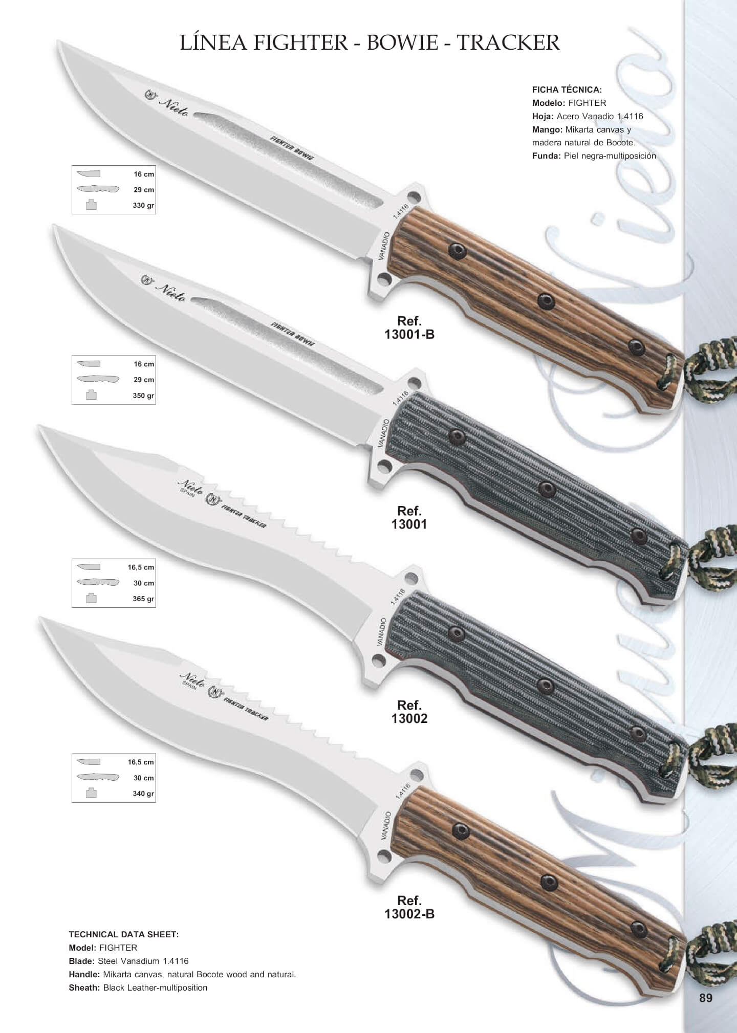 Cuchillos tácticos de la línea Fighter con funda multiposición de piel y acero Vanadio.