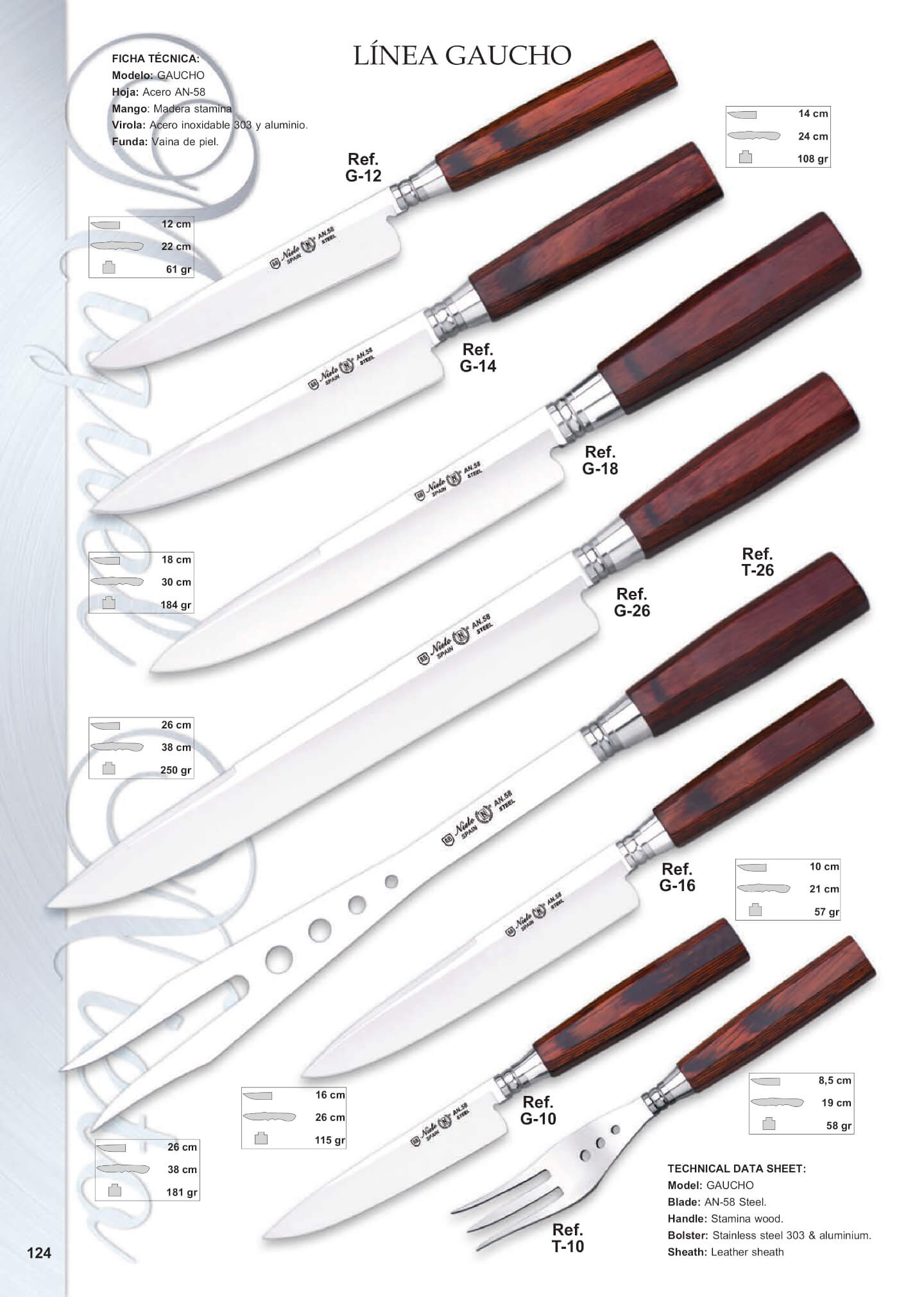 Hoja de acero AN58.Mango de madera de stamina.Virola de acero inox 303 y aluminio.Funda vaina de piel.