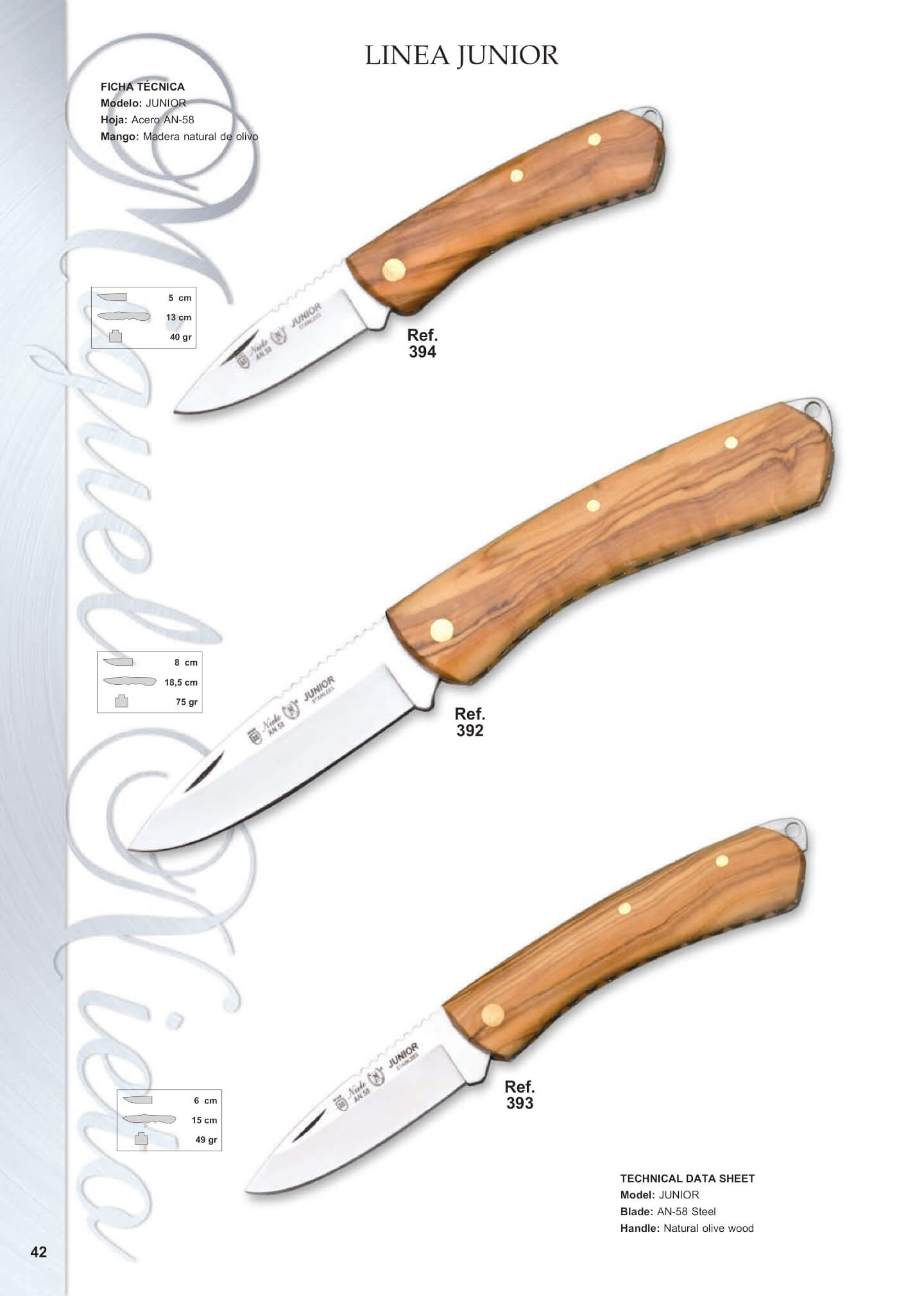 Mango: madera natural de olivo. Longitud de la hoja: 8 cm. Longitud total: 18.5 cm. Peso: 75 grs.