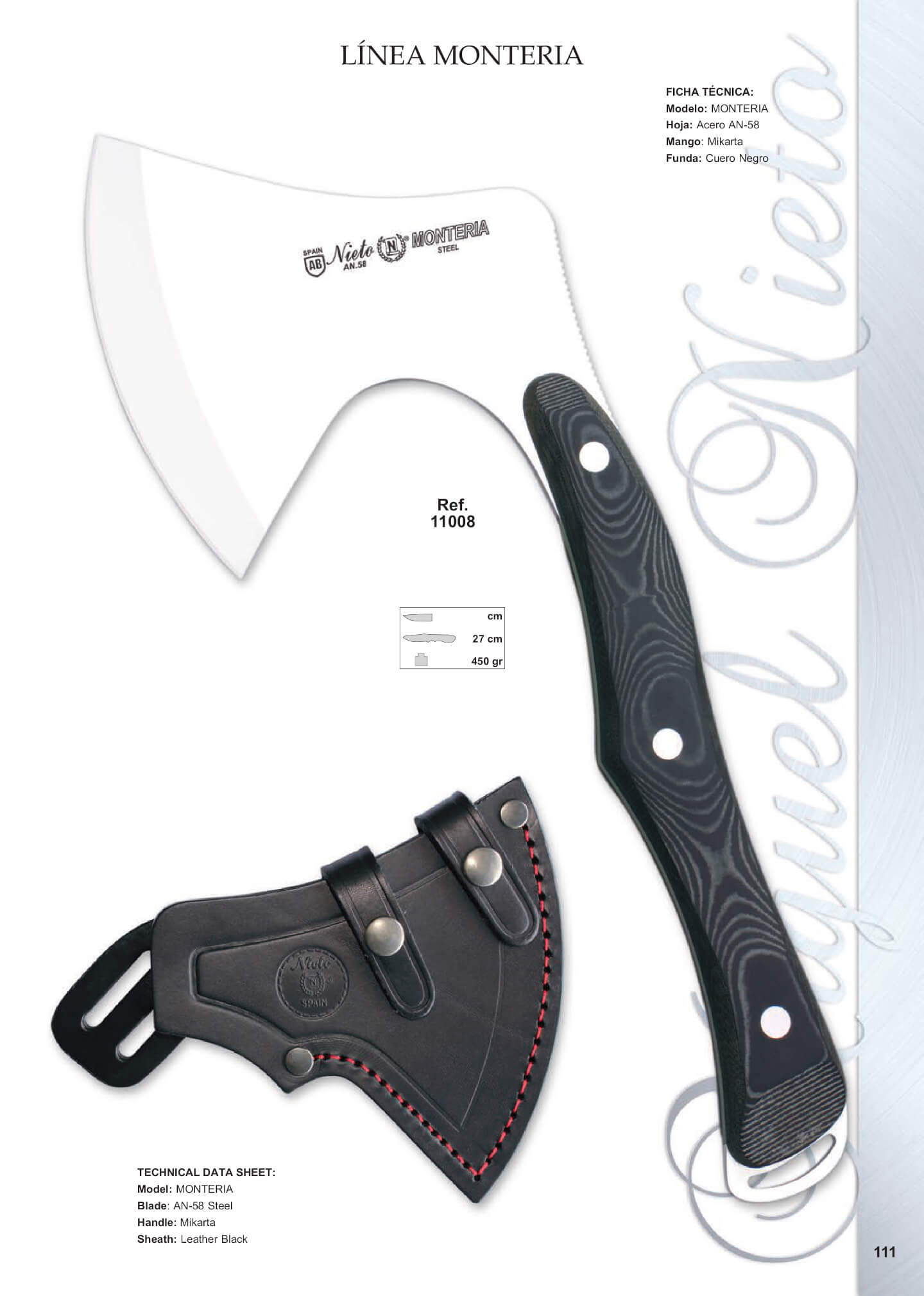 Hacha "M. Nieto". Línea Montería. Hoja de acero AN58. Mango de mikarta. Funda de piel de primera calidad negra. Longitud total: 27 cm. Peso: 450 grs.