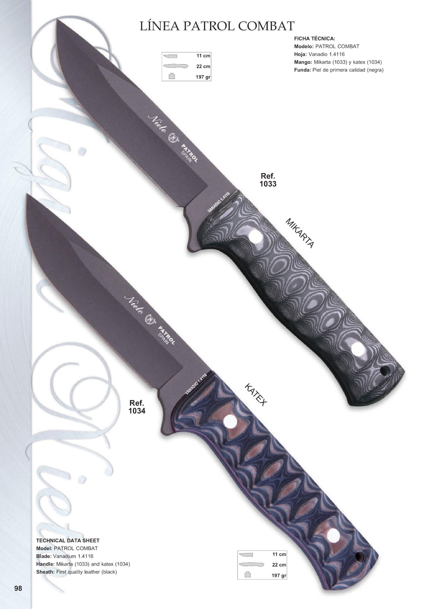 Hoja: 11 cm. Longitud total: 22 cm. Peso: 197 grs. Mango: Mikarta.
