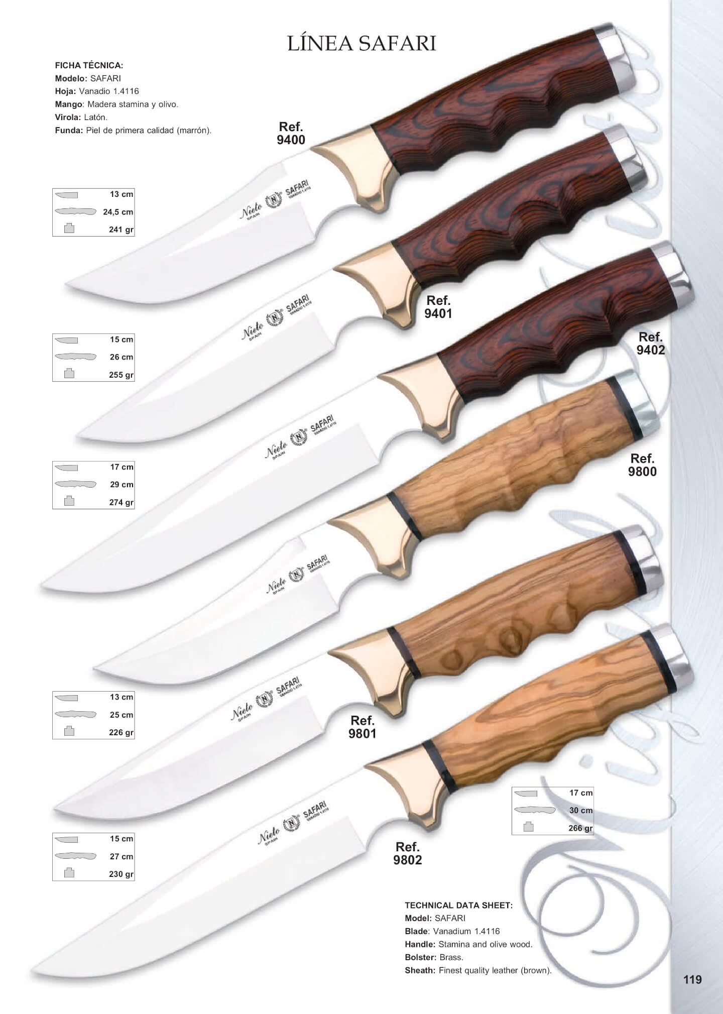 Hoja de acero Vanadio 1.4116.Mango de madera natural de stamina o olivo.Funda de piel de primera calidad (marrón).Virola de laton y alpaca
