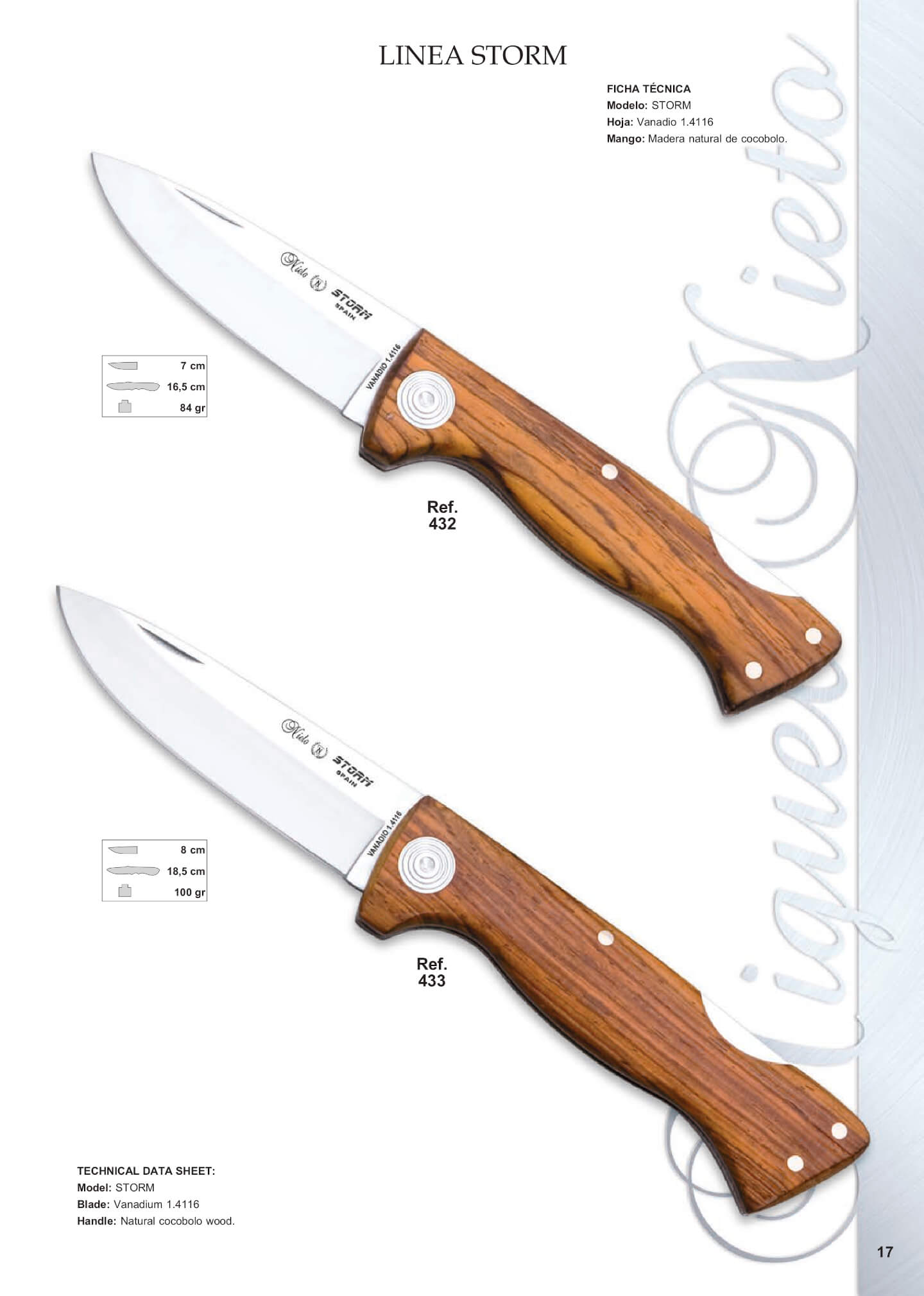 Navajas M. Nieto. Linea Storm.Hoja: acero AN-58. 432Mango: madera natural de cocobolo. Hoja: 7 cm. Longitud total: 16.5 cm. Peso 84 gr. 433Mango: madera natural de cocobolo. Hoja: 8 cm. Longitud total: 18.5 cm. Peso 100 gr.