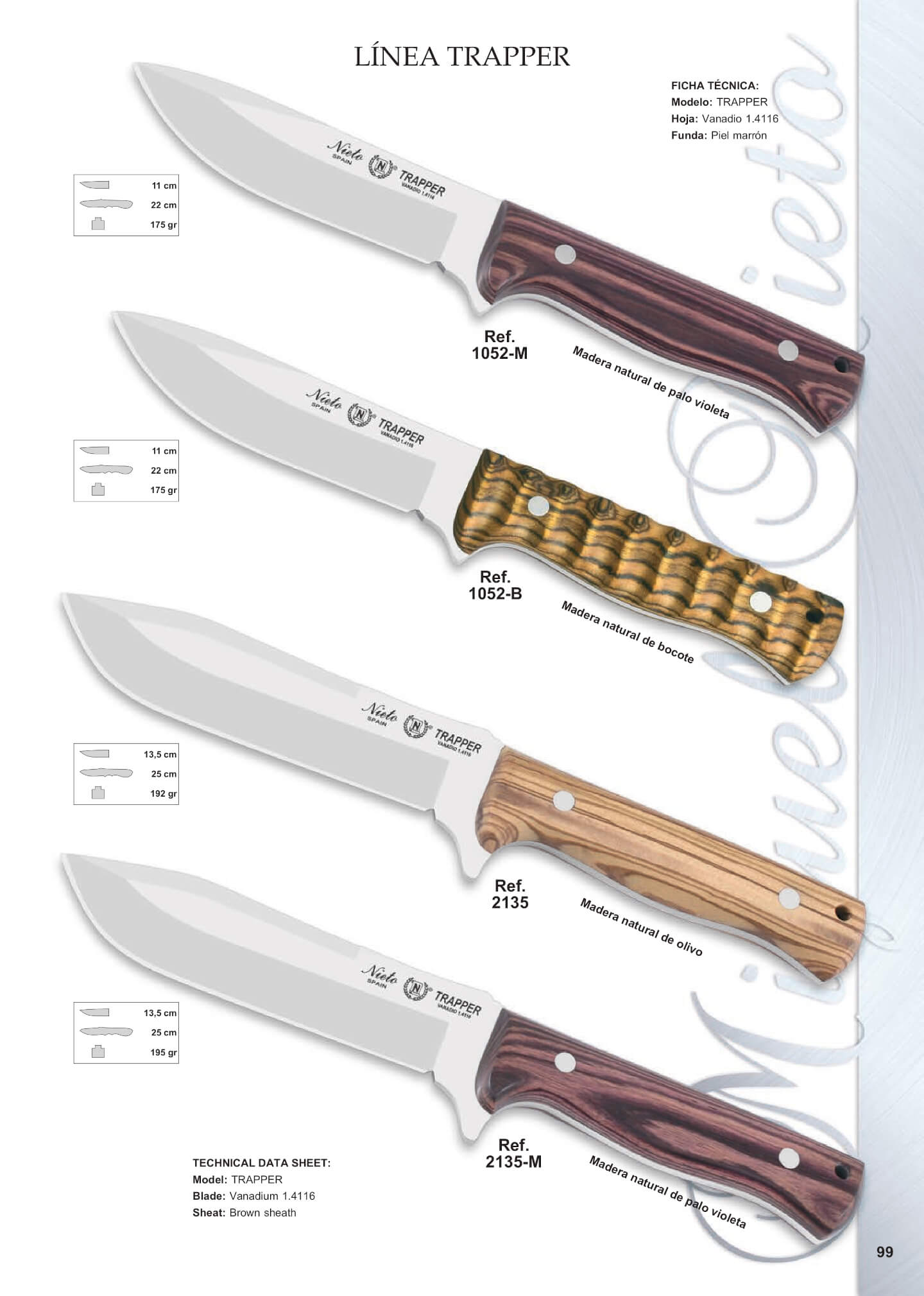 Cuchillos de caza y campo de la línea Trapper de acero Vanadio 1.4116. Un cuchillo de bushcraft enterizo con hoja de acero Vanadio 1.4116 y funda de cuero marrón.