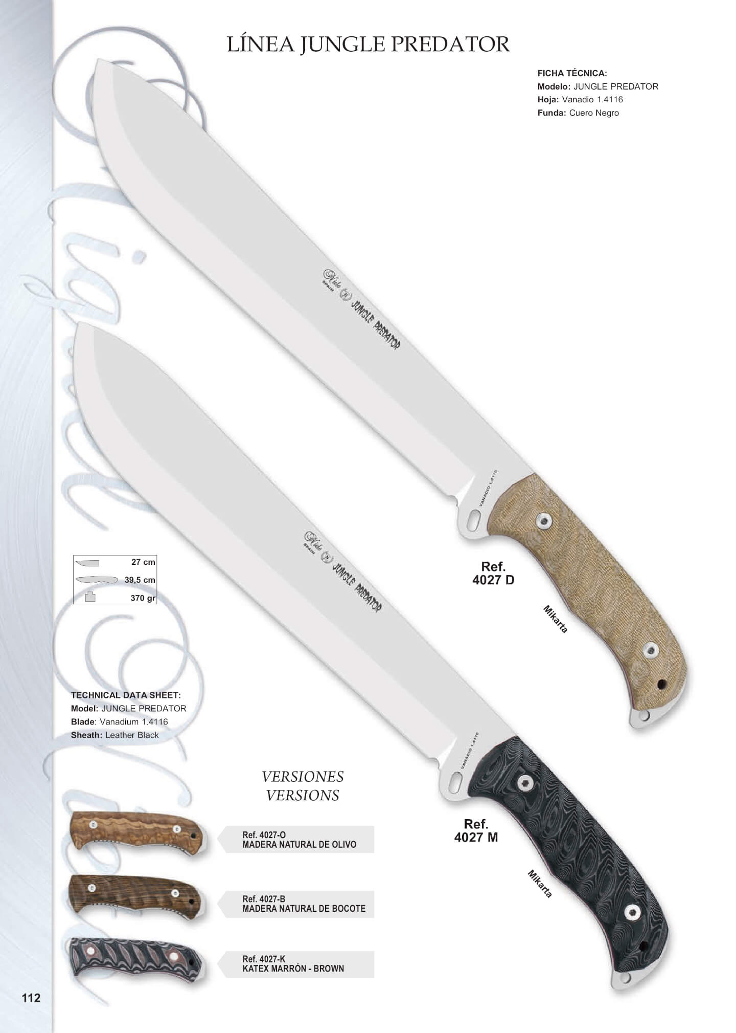 Machete Nieto Jungle Predator.Un machete latino enterizo con hoja de acero Vanadio 1.4116 de 27 cm de longitud y funda de cuero negro. Con una longitud total de 39.5 cm y un peso de 370 gr.