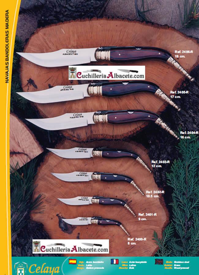 Navaja clásica bandolera con hoja de acero inoxidable. Mango de madera roja y virola de latón. Bloqueo de carraca (6 muelles).