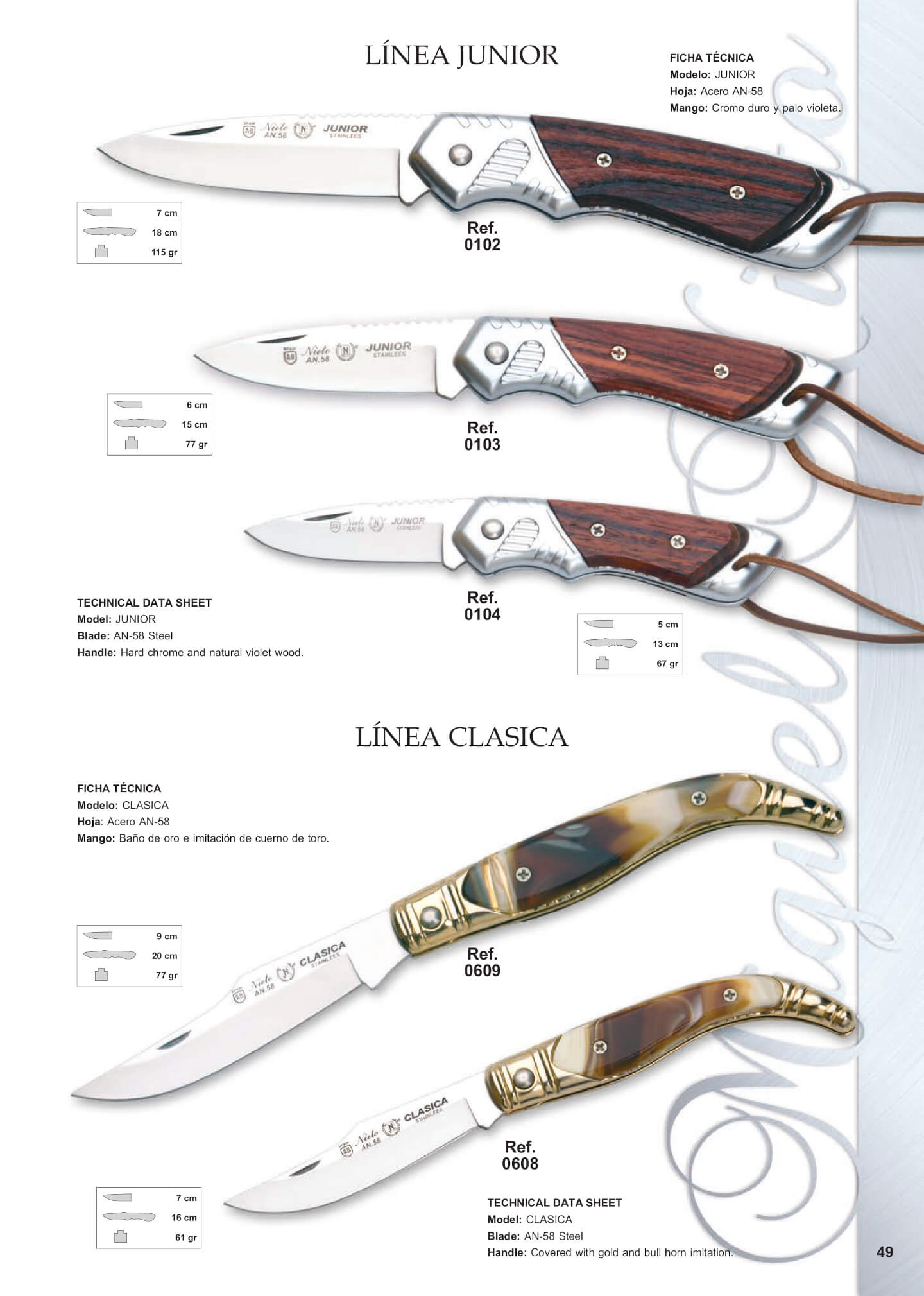 Mango: cromo duro y palo violeta. Longitud de la hoja: 5 cm. Longitud total: 13 cm. Peso: 67 grs.