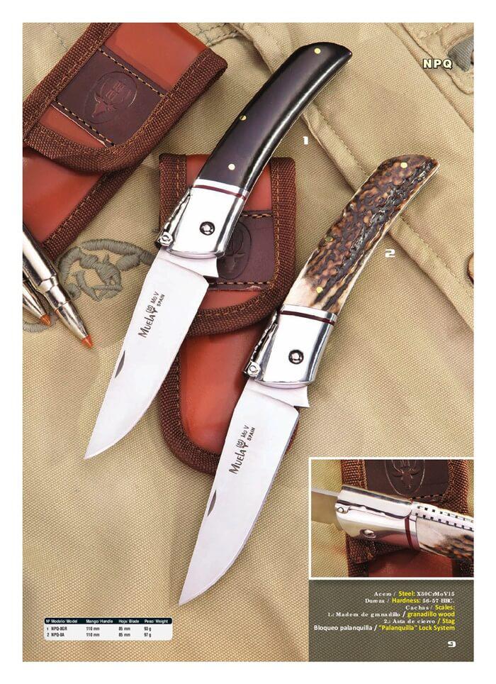 Navajas palanquilla en dos versiones, asta de ciervo y madera de granadillo. Con un bonito cintillo en rojo en el casquillo de aluminio y unas medidas de mango de 11cm y hoja de 8,5 cm.