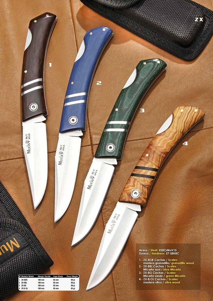 Navajas de caza ZX fabricadas con el acero característico de la casa Muela, X50CrMoV15, y cachas en distintos tipos de materiales.