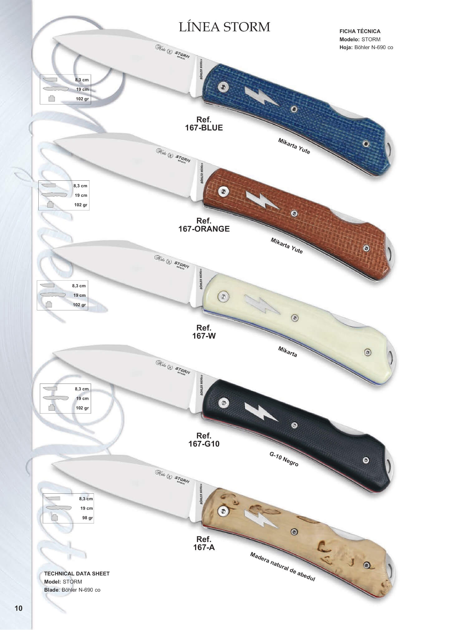 Navajas tácticas Nieto línea Storm con hoja de acero Böhler N690 Co de 8,3 cm y bloqueo de botón trasero. Con agujero para cordón fiador.