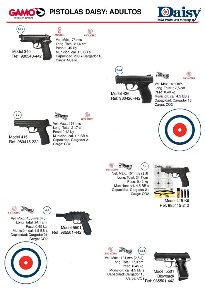 Velocidad máxima: 131 m/s (2.5 J). Longitud total: 17.3 cm. Peso: 0.45 kg. Munición: cal. (4.5) BBs acero. Capacidad: cargador 15. Carga: CO2.