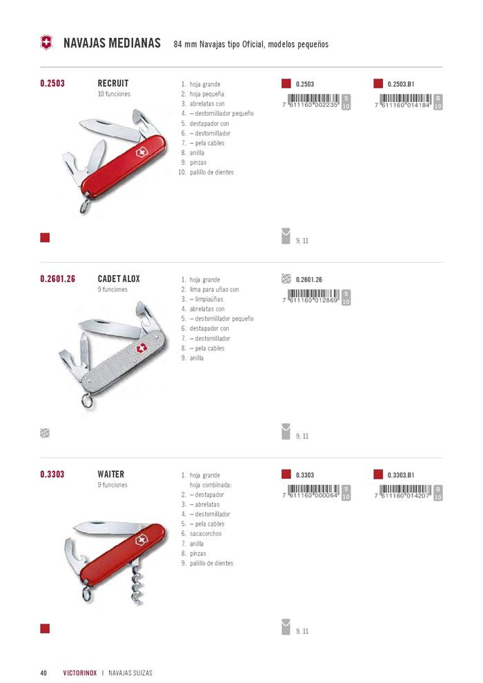 hoja grande, sacacorchos, destapador, abrelatas, destornillador 5 mm, pela cables, anilla, palillo de dientes, pinzas. Medidas: 12x84 mm. Peso: 35 gr.