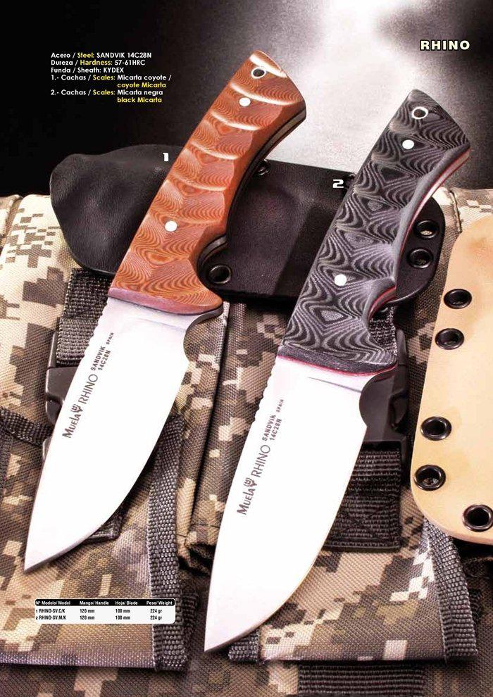 Cuchillos enterizos Muela Rhino con acero Sandvik 14C28N con cachas de micarta y funda de Kydex incluida.