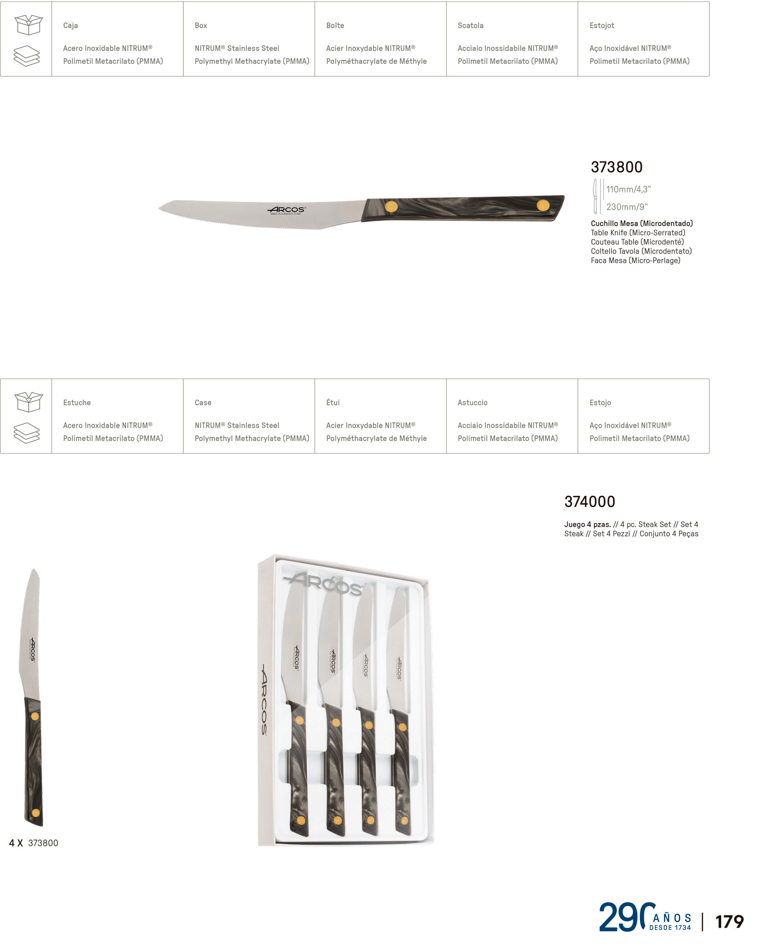 Esta colección se compone de cuchillos de mesa que cuentan con una hoja microdentada de Acero Inoxidable NITRUM de 110 mm y con un mango mayoritariamente de color negro de Acrílico (PMMA) de 120 mm. Teniendo una medida total de 230 mm.
