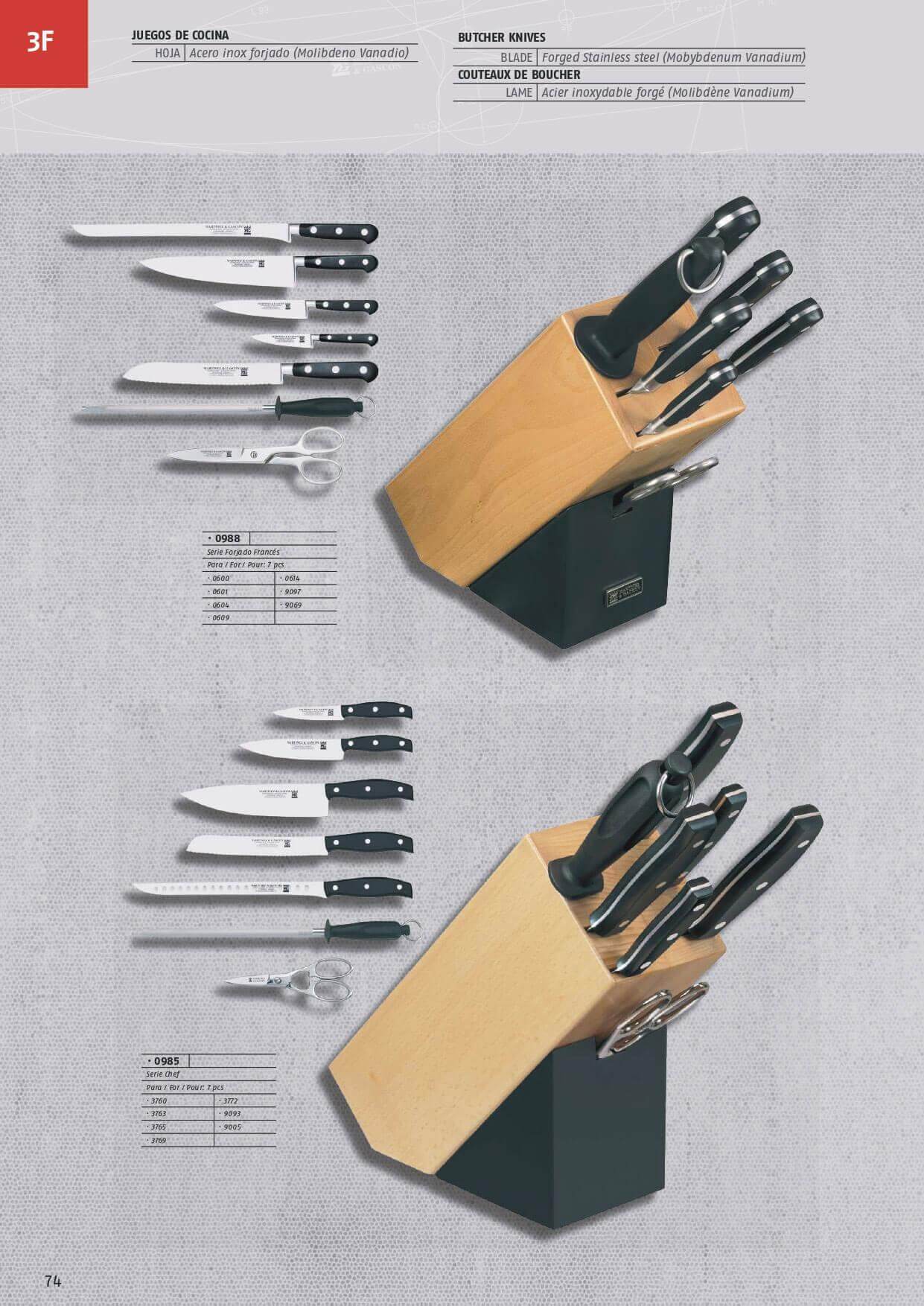 Incluye 7 piezas: tijeras, chaira, cuchillo jamonero alveolado (28.5 cm), cocineros de 15 y 20 cm,cuchillo panero y puntilla.