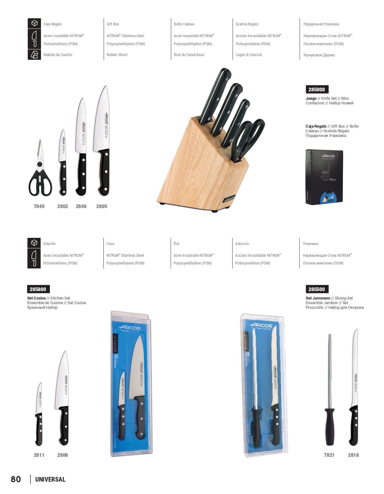 Conjunto cuchillos de cocina. Hoja de acero inoxidable forjado NITRUM, mango POM, taco de madera de haya. Serie UNIVERSAL.