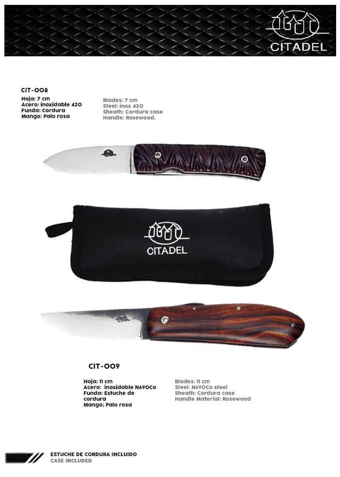 CIT-008: STAVANGER WOOD ZEBRAHoja: 7 cmAcero: 420 inoxidableFunda: CorduraMango: PalisandroCIT-009: PHAN THIET WOODHoja: 11 cmAcero: N690Co inoxidableFunda: Estuche de corduraMango: Palisandro