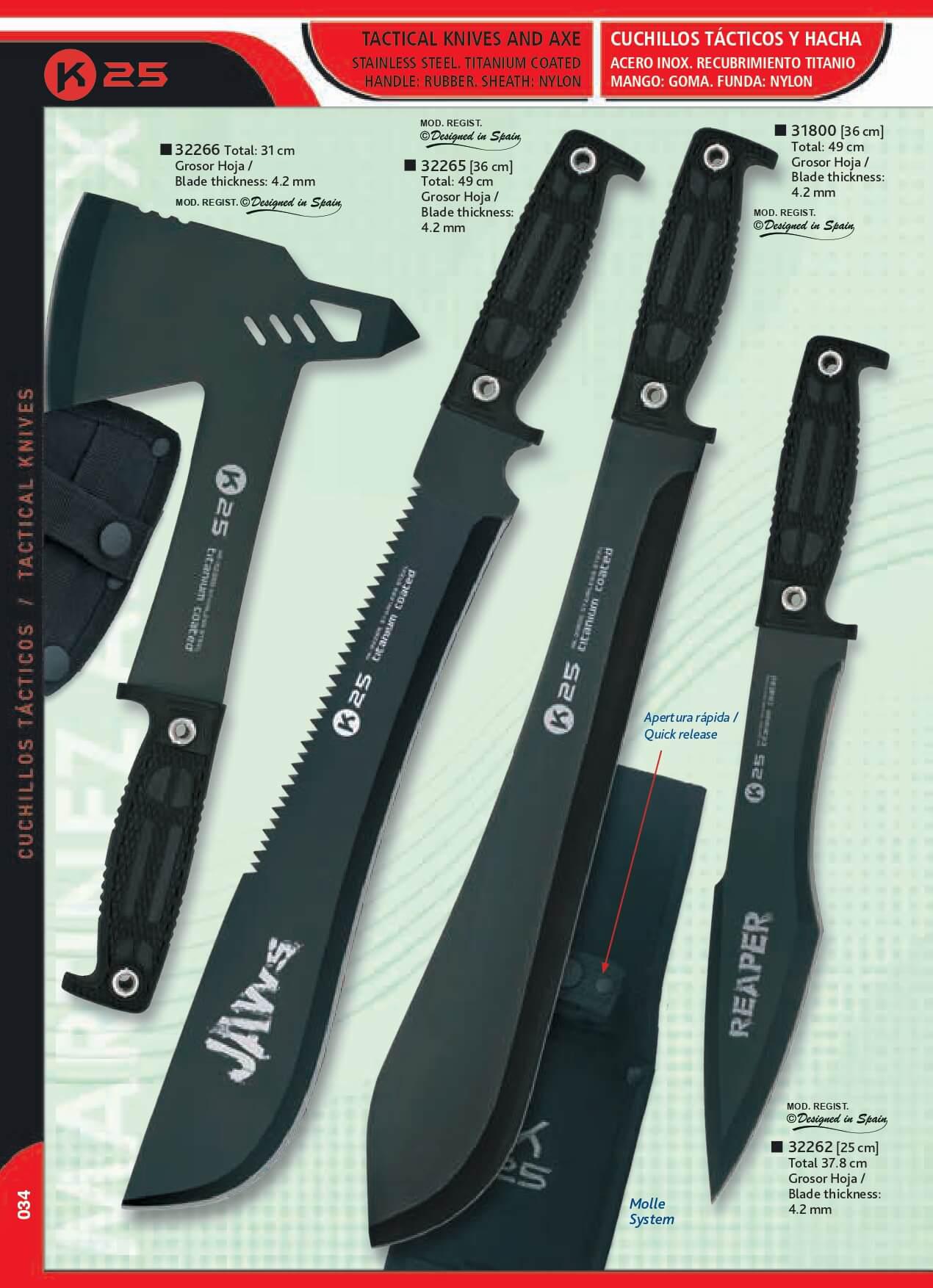 Machete, cuchillos tácticos y hacha táctica de K25