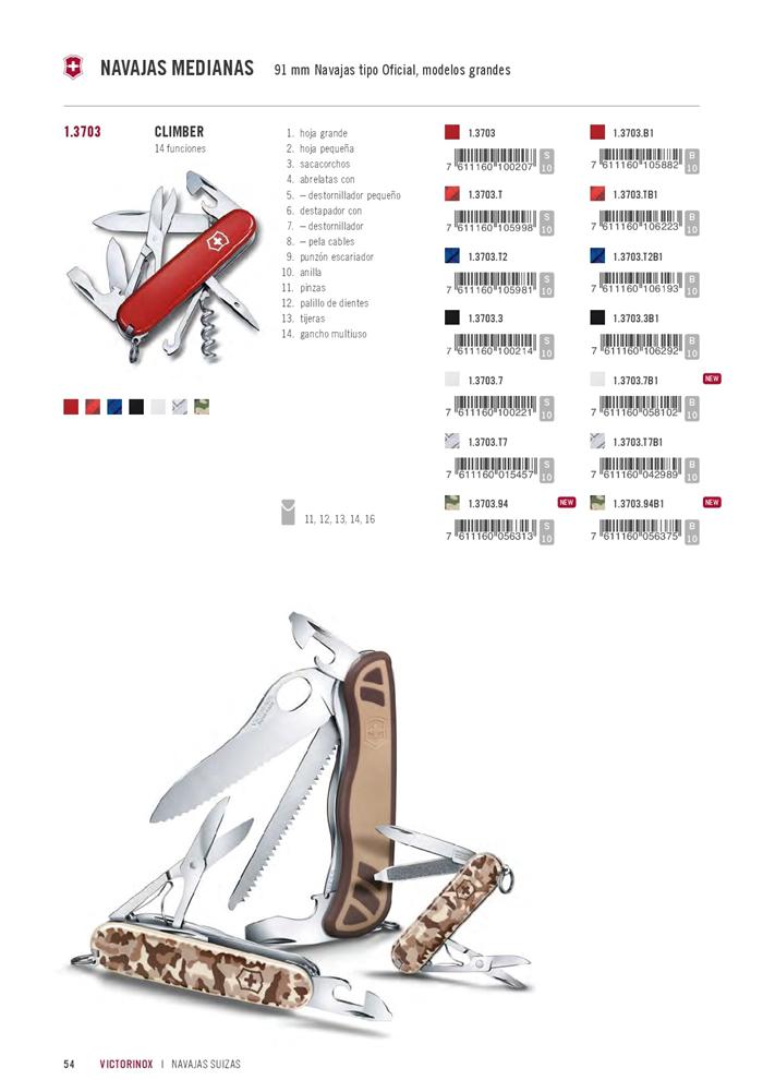 hoja grande, hoja pequeña, abrelatas, destornillador 3 mm destapador, destornillador 6 mm, pela cables, punzón escariador, sacacorchos, tijeras, gancho multiusos, palillo de dientes, pinzas, anilla.