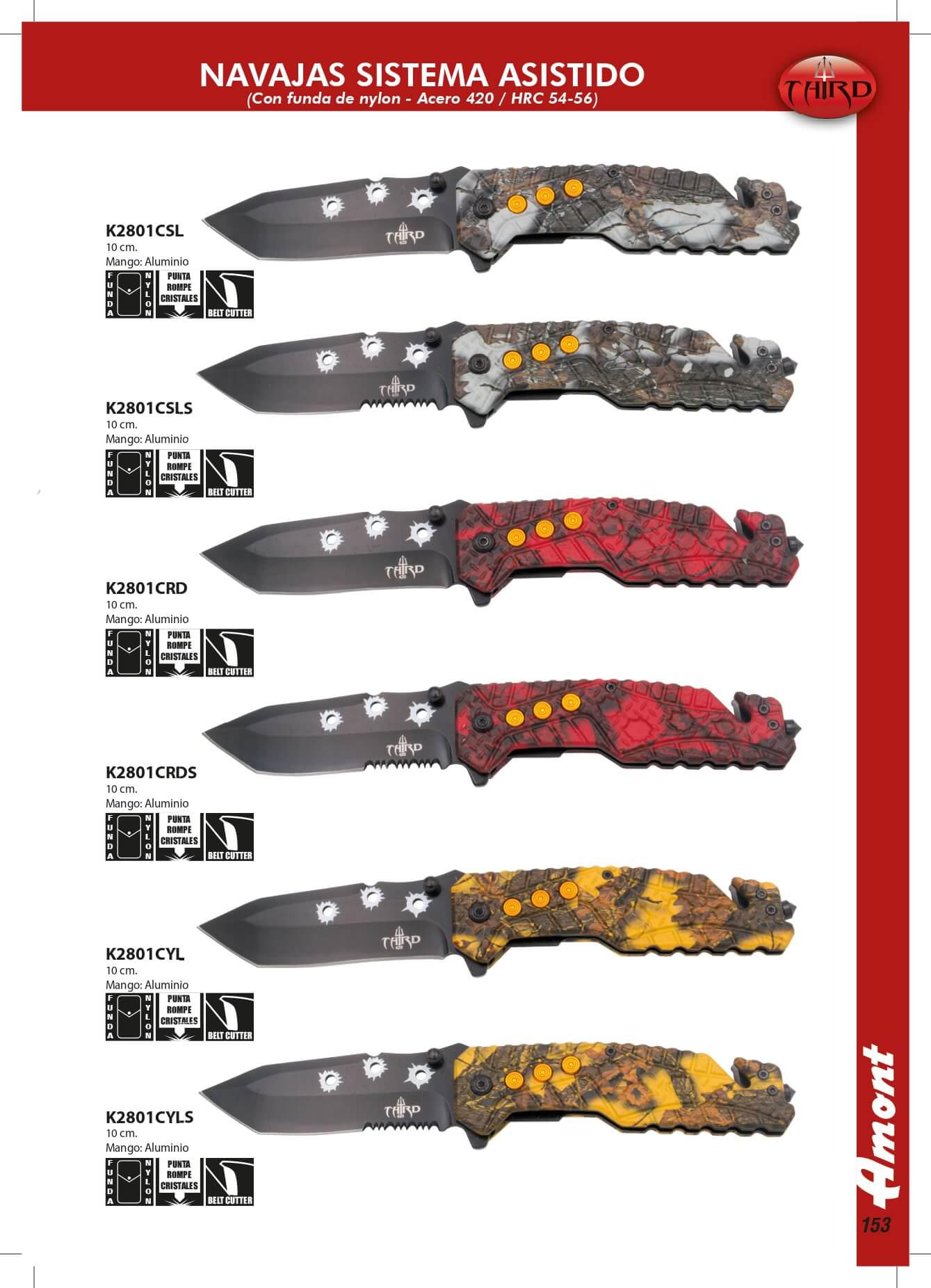 Knives with assisted opening. Sheet of steel 420. HRC 54-56. Sheet length: 10 cm. Handle: aluminum Includes nylon sheath. Tip breaks crystals. Cut belts