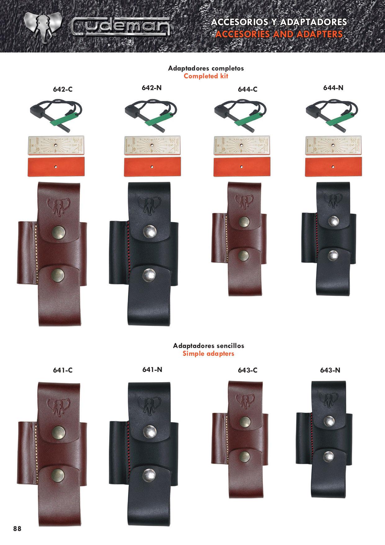 Black or brown leather couplings for different knife models. The 642 models include accessories like flint and honing stone.