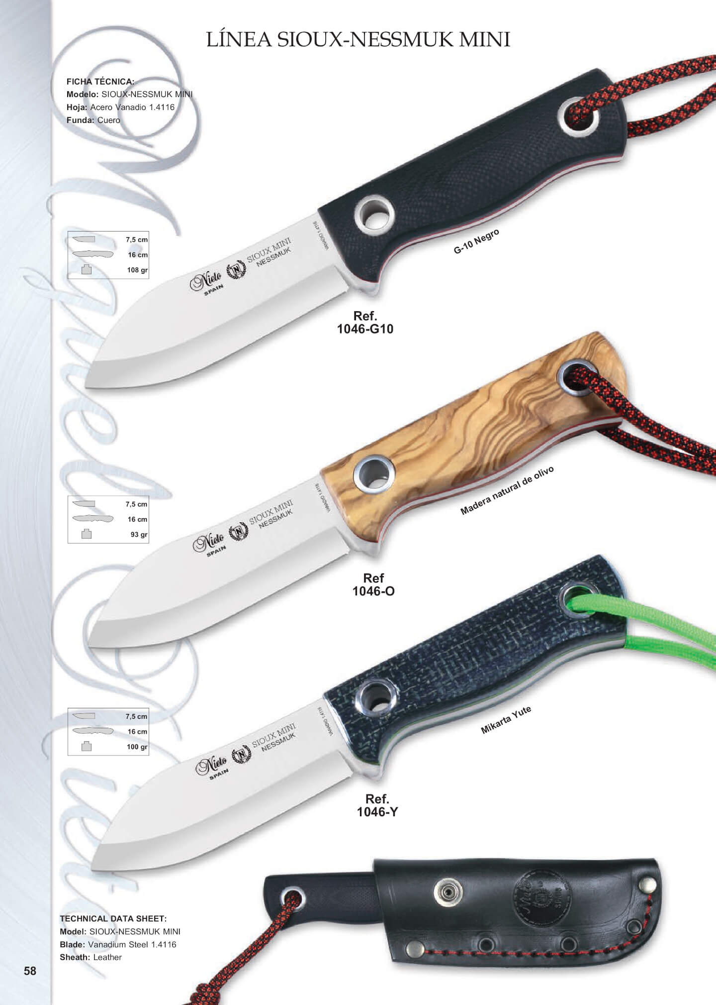 New Nieto Sioux Nessmuk mini hunting knife, with 7.5 cm Molybdenum Vanadium steel blade and leather sheath.