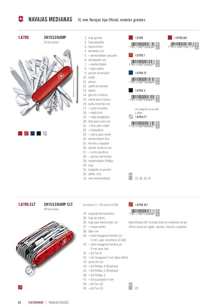 large blade, small blade, reamer punch, can opener, 3mm screwdriver, bottle opener, 6mm screwdriver, wire stripper, scissors, multi-purpose pliers, wire cutter, terminal press, scale remover, hook remover, ruler (cm), ruler (inches) , wood saw, nail file, nail cleaner, metal saw, metal file, magnifying glass, 1/2 Phillips screwdriver, 2.5 mm screwdriver, 4 mm chisel and scraper, multipurpose hook, toothpick, tweezers, pressure pen, pin, stainless steel, ring, mini-screwdriver, corkscrew