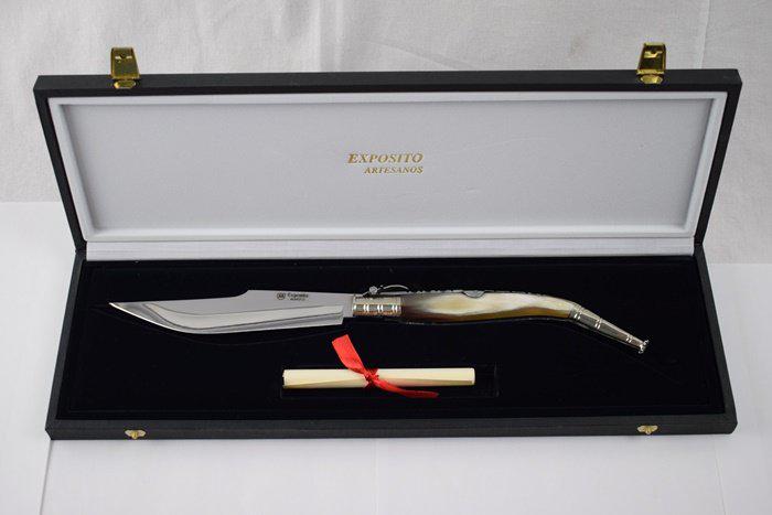 Cutter, faites à la main. Blade, acier inoxydable 440, de 13,5 cm de long. Sans gravure. Poignée de corne de taureau. Est emballé dans une boite cadeau et un certificat de l'artisan. Longueur totale 30 cm ouvert.