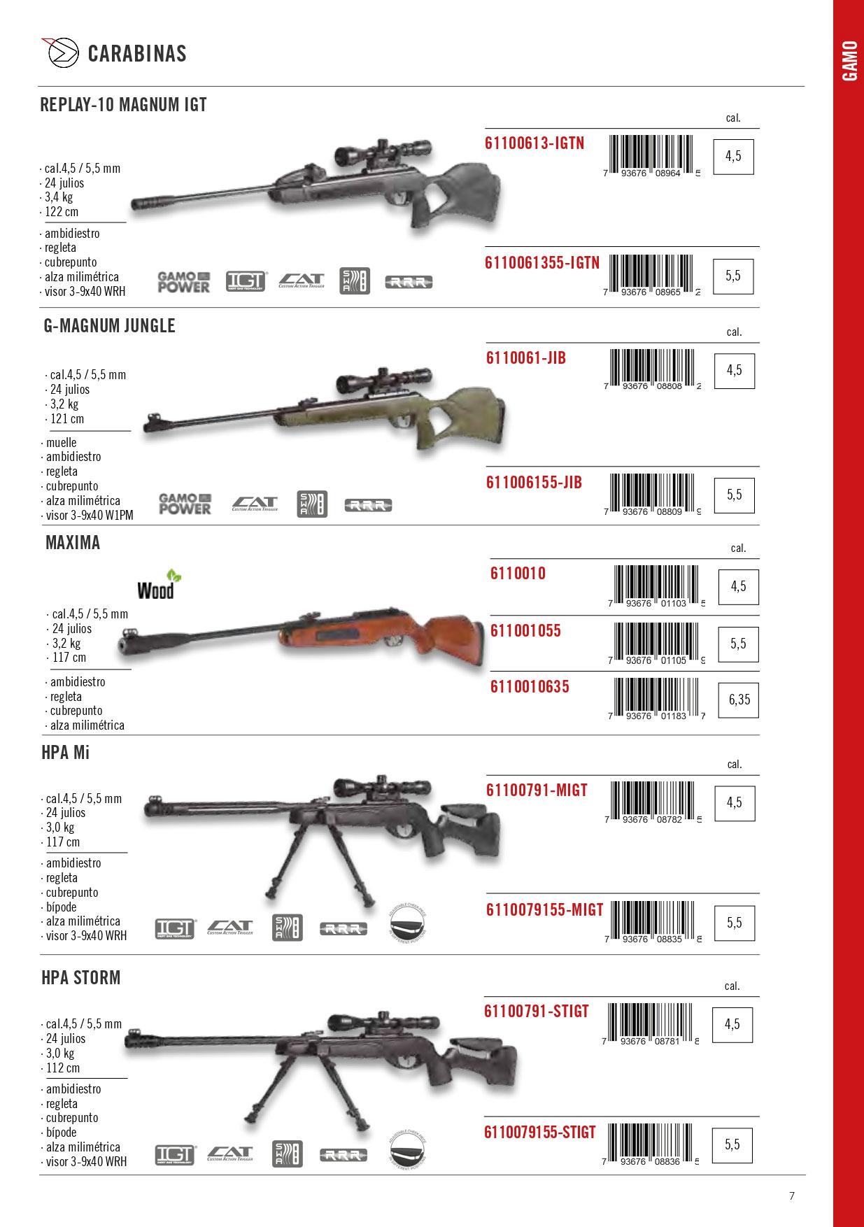 Cal. 4,5 ou 5,5 mm. 24 joules. 3,4 kg. 122 cm. IGT. Rail de réduction de recul. Triger d'action lisse. Absorbeur d'ondes de choc. Portée 3-9X40WR incluse.