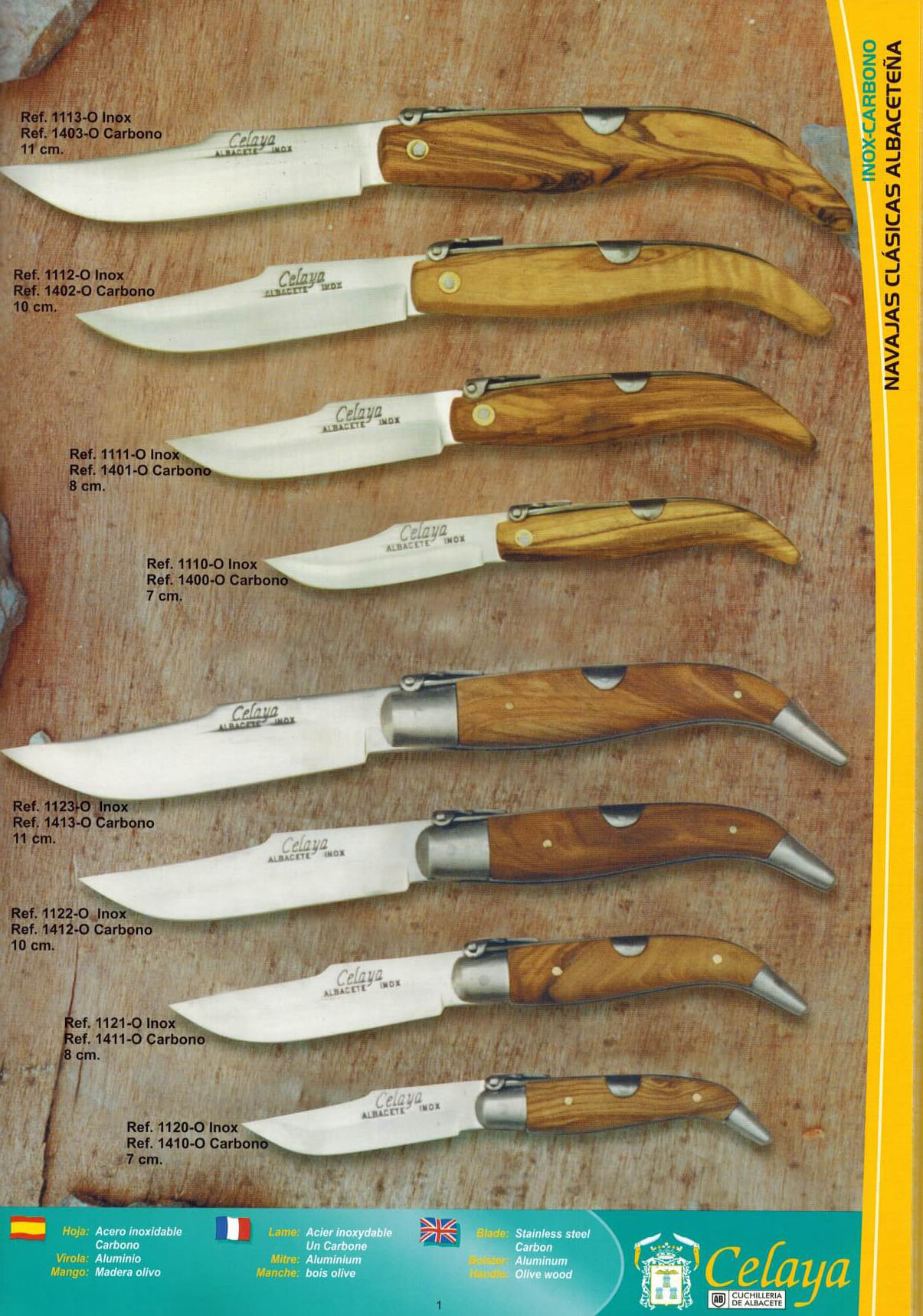 Couteaux de poche classiques d'Albacete avec lame en acier inoxydable ou en acier au carbone. Manche en bois d'olivier.
