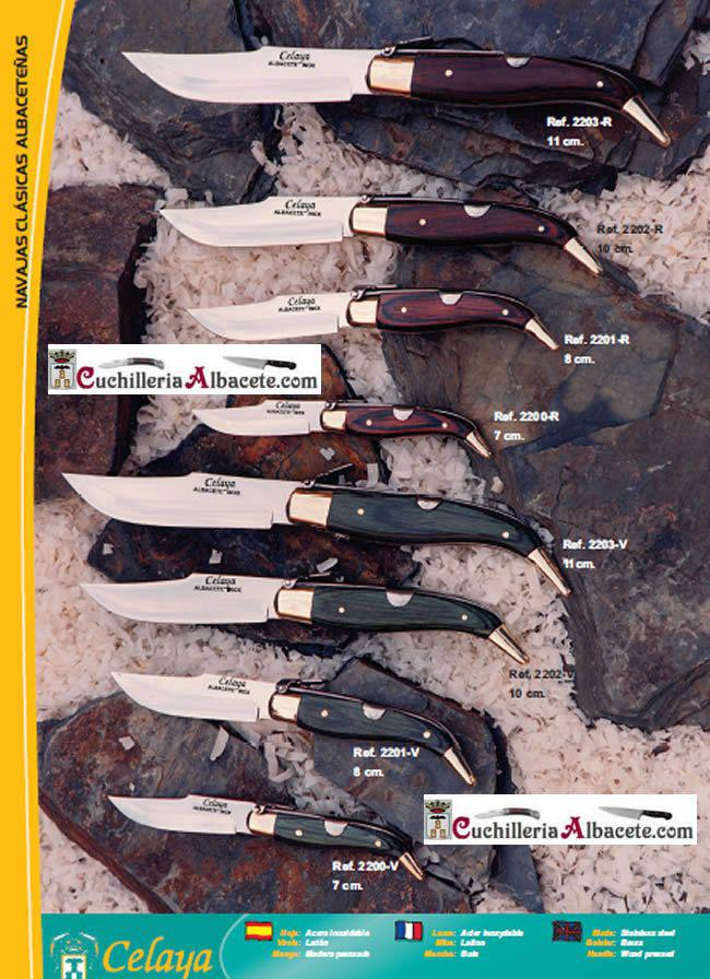 Couteaux de poche classiques d'Albacete avec lame en acier inoxydable ou en acier au carbone. Manche en bois pressé et virole en laiton.